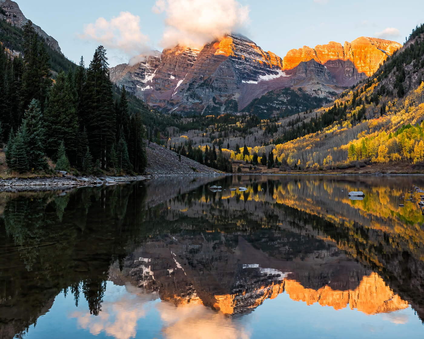 Snowy peaks over fall foliage can provide amazing images, so you want to be dressed appropriately to take advantage of those opportunities. Jackets, fleece clothing, gloves, warm socks and sturdy hiking boots are important items to bring along. A rain cover for your camera and lens will allow you to shoot through the passing weather systems.