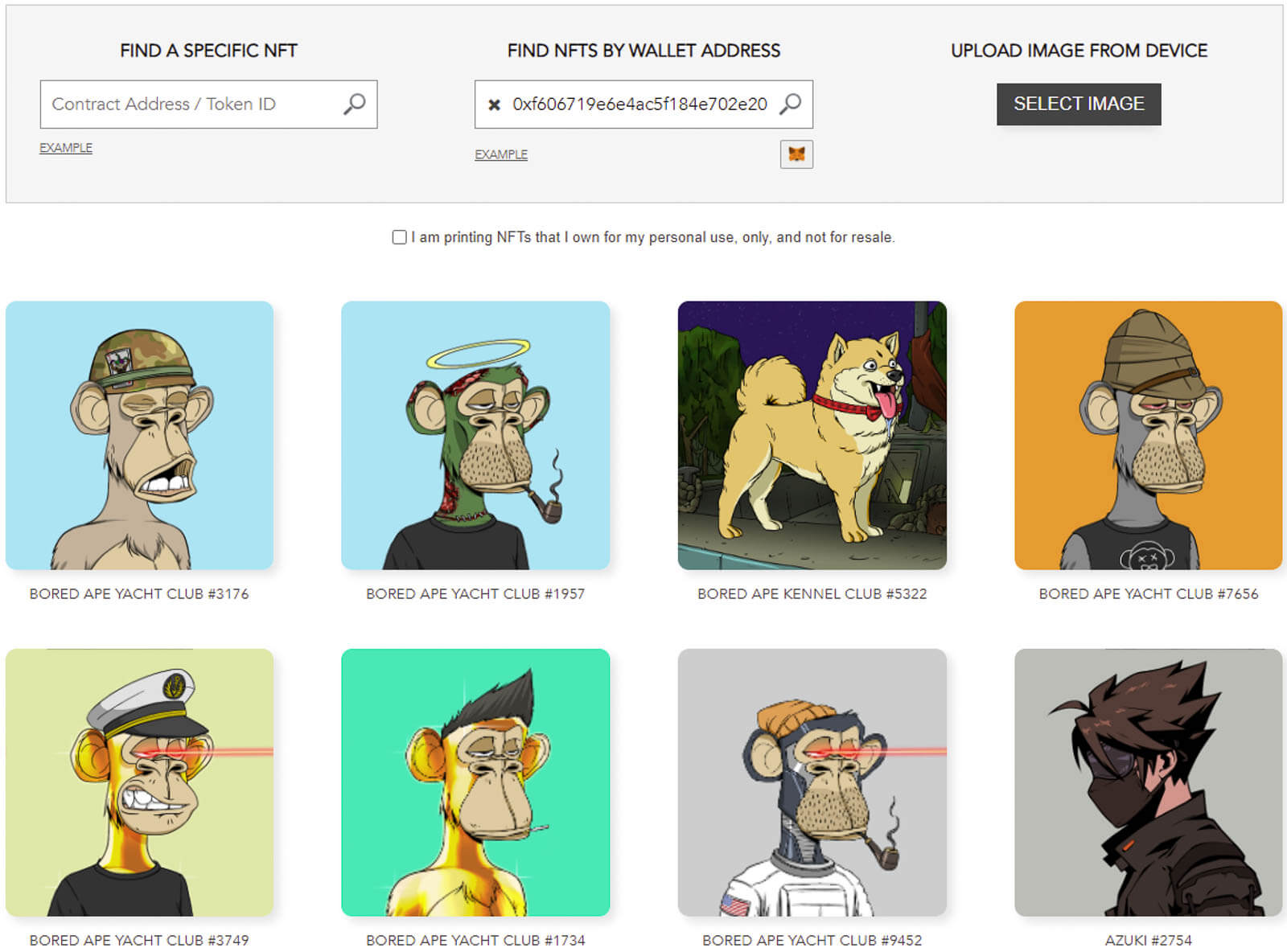 The service allows you to print any NFT you know the contract address/token ID or wallet address for. Technically, this is meant to be used only for NFTs that you own. Before printing, Fine Art America prompts you to agree that “I am printing NFTs that I own for my personal use, only, and not for resale.” However, it’s not clear whether this is enforced.