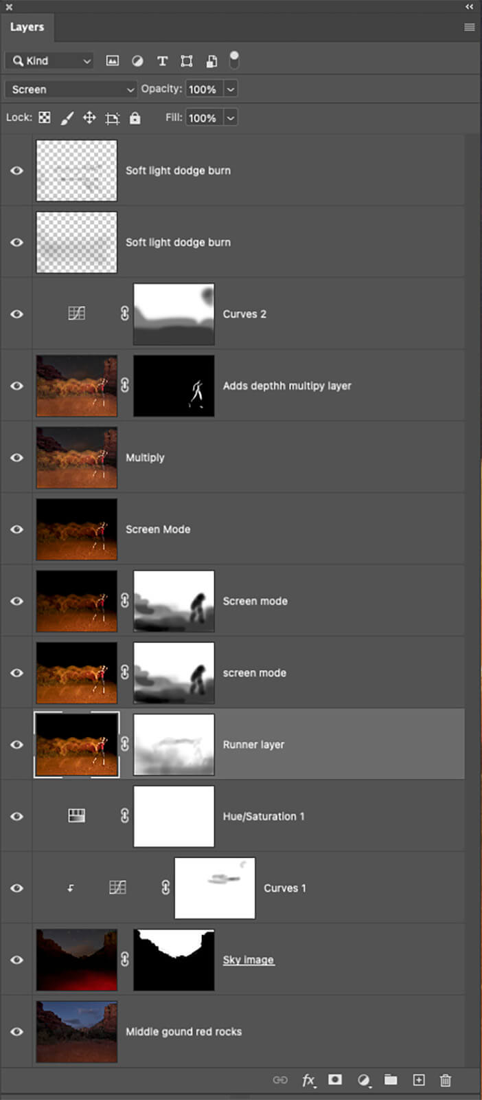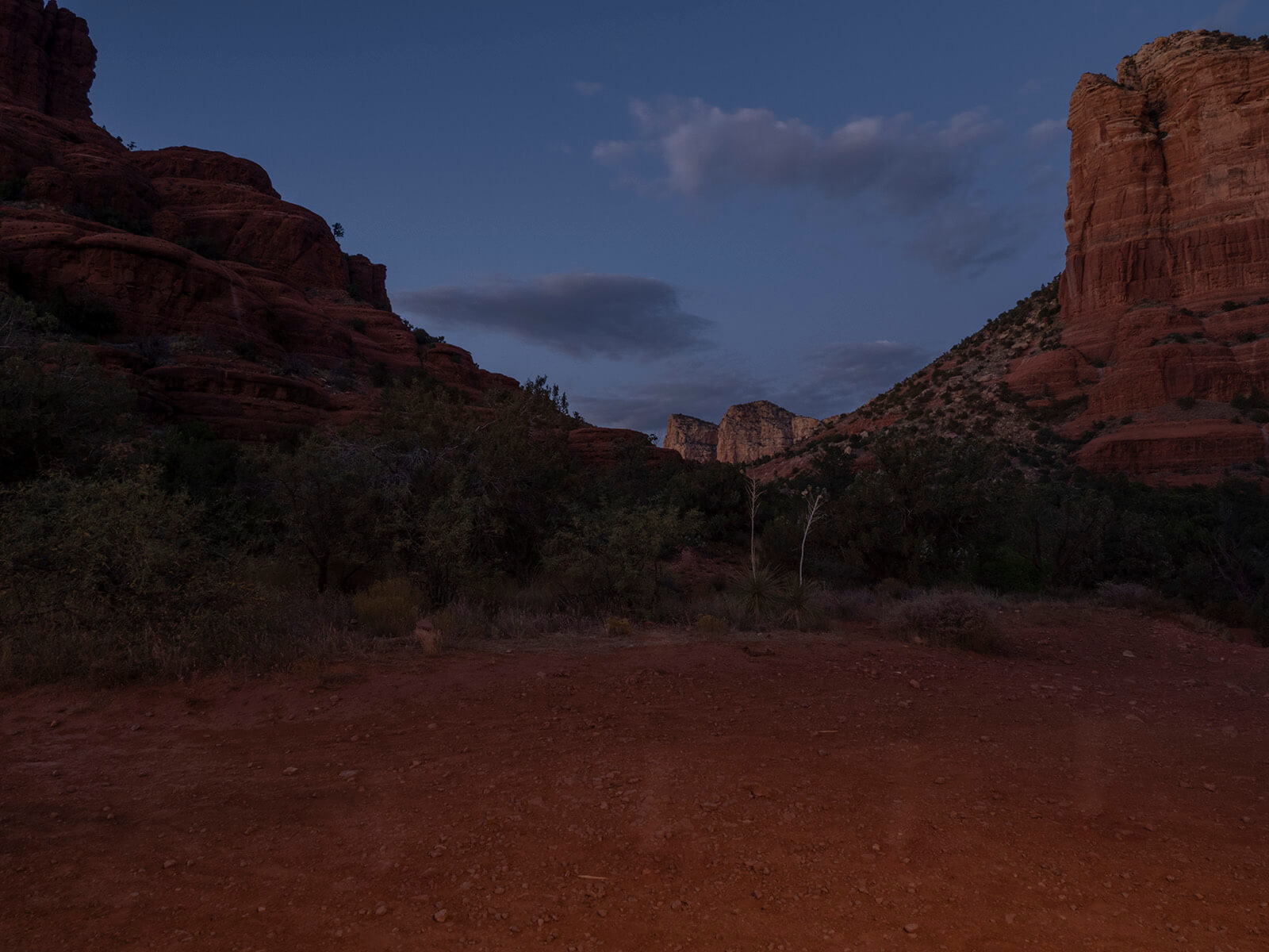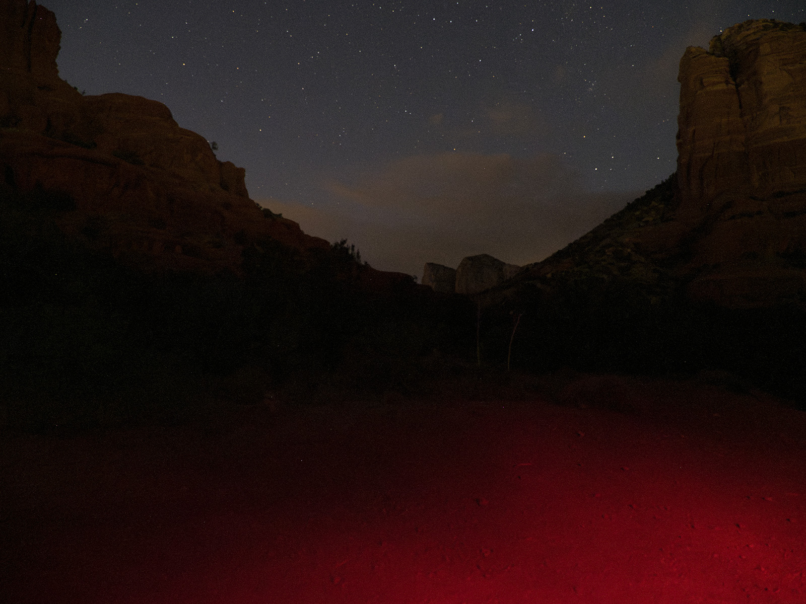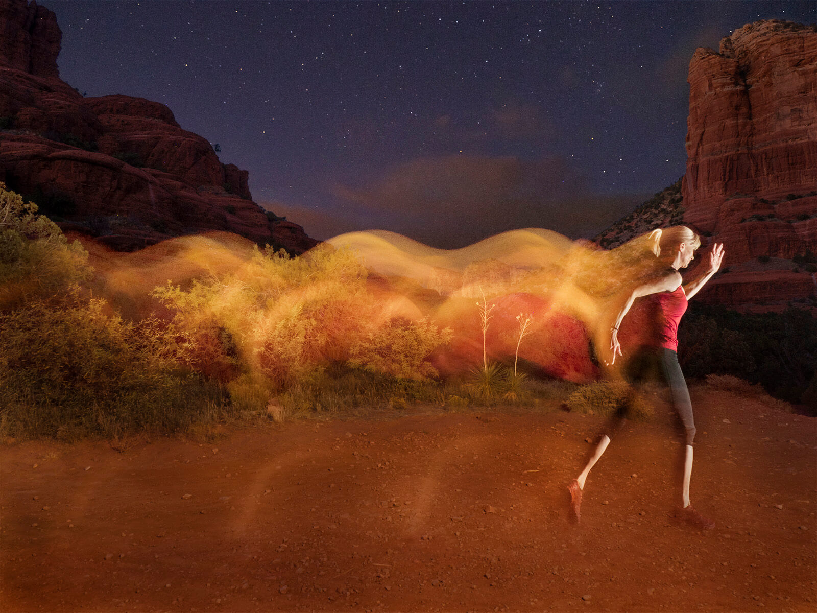 I made one image for the streaks of the jogger moving through the scene. The exposure time of that shot was about three seconds with the flash going off following the run. I tapped Sedona personal trainer, Kim Hollenback of Solid Rock Fitness. She ran through the scene multiple times until we felt good streaks were recorded. See the final image for the result.