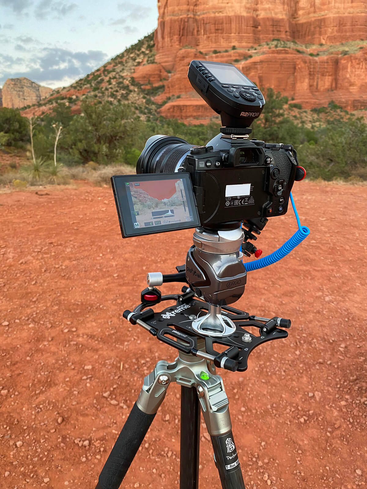 I mounted an Olympus OM-D E-M1 Mark III with a 12-100mm M. Zukio f/4.0 lens on an Ergo Platyball with a disc. I added an eXtreme between the Ergo and the tripod, and a Platypod Arm to the eXtreme to hold my Pluto Trigger. To make this work, I needed to have the trigger off-camera. The hot shoe was occupied by the remote trigger for the flash. This configuration made it easy to move whatever I hooked up to my camera as one unit to the ground.