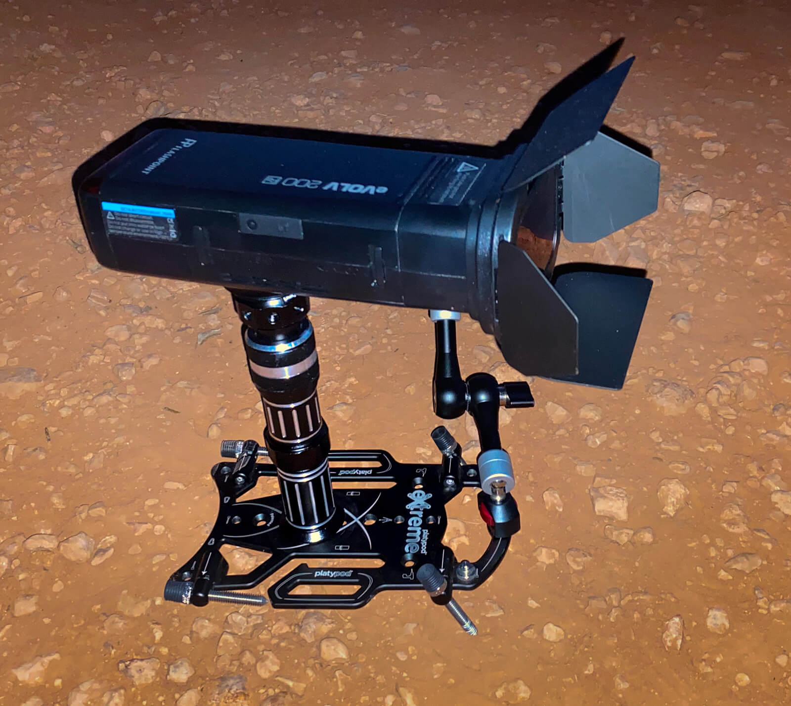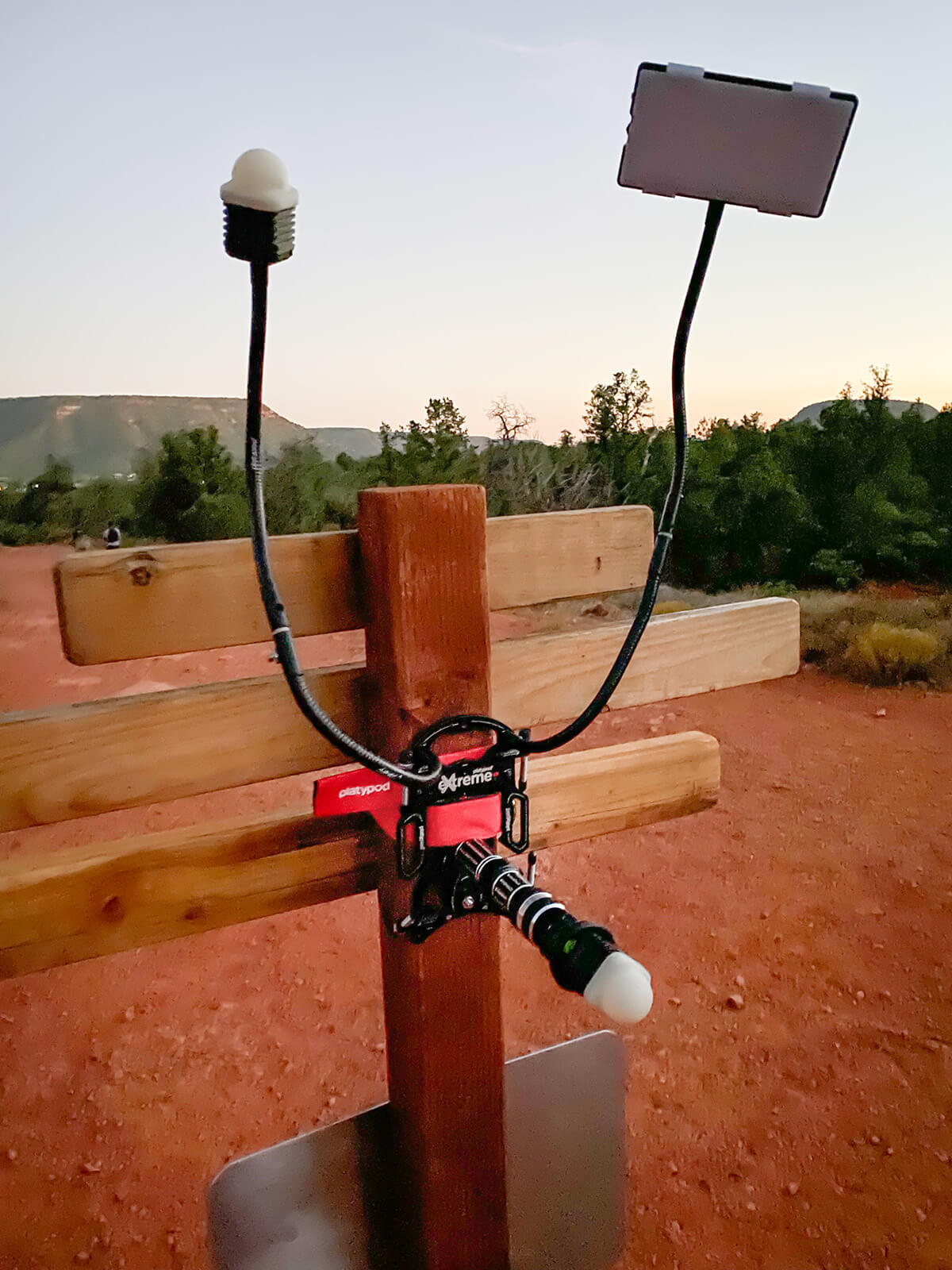 To attain the streaks, night needs to have fallen. At least, for the amount of light I was able to bring on the scene. I used an LED light panel from Litra Cube along with two Litra Torch Cubes. Then, I deployed the using a Platypod eXtreme mounted on a signpost using the 36 inch strap. I added a Platypod Handle and attached two gooseneck using the 1/4 inch receptors built into the eXtreme.
