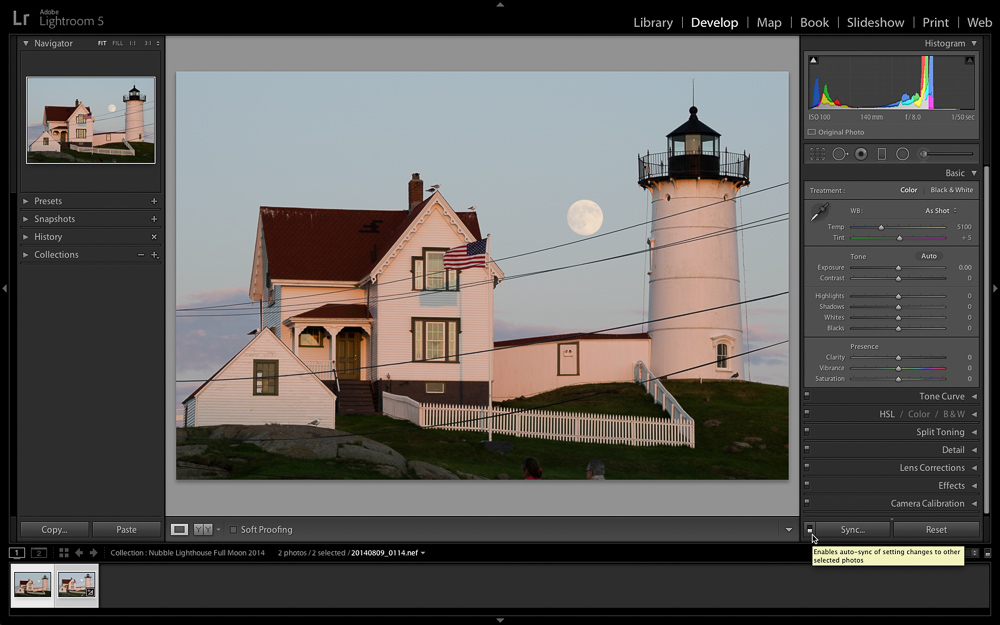 After returning home and importing the photos into my Lightroom catalog I needed to process these two photos the same exact way so that I could seamlessly blend them together. There are a couple of ways to synchronize settings between multiple photos in Lightroom, but for this job I enabled Auto Sync. Auto Sync is an incredibly powerful tool that allows you to process multiple photos at once. Start by selecting all of the photos you want to process the same exact way (in my case it was just these two). Then click the little switch next to the Sync button to change that to Auto Sync.