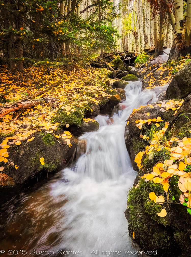 Late afternoon is perfect for an uphill walk to Boulder Brook. As the altitude is a bit high at the brook, at over 9,000 feet, I suggest hiking in after you are acclimated to higher elevations. I also recommend hiking boots, as the path can be slippery, with obstructions from branches and rocks. The brook is magical in autumn, cascading downhill and surrounded by a blanket of yellow leaves fallen from nearby trees. Consider wide-angle and telephoto shots. Walk around and downstream, checking out several perspectives.