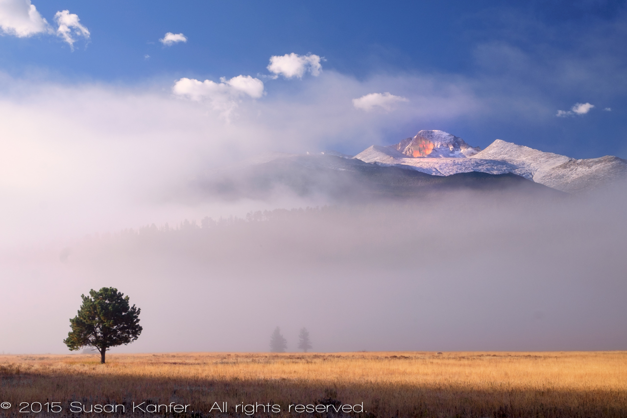 Plan to visit Sprague Lake more than once. There is a chance you will be fogged out some mornings. Clouds constantly change from day to day. If you are lucky you may have frost on the grasses at the side of the lake, backlit by the rising sun.