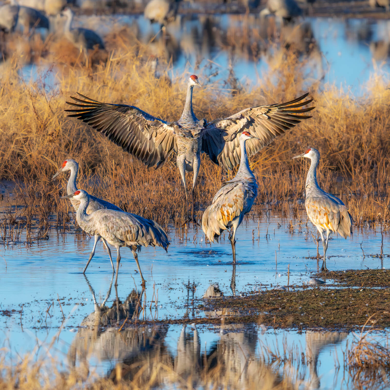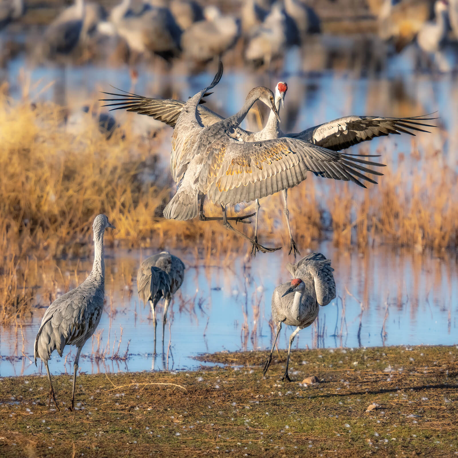 When the Sandhill Cranes jump, prance and dance it is usually associated with courtship and mating behavior. It can also be a release of energy or a way to say, “Hey! This is my territory (or woman)!” Wingspans that can reach seven feet are flashed with an accompanying jump, ensuring the display is magnificent. It can also be hard to capture in photos. Watching and learning behavior is a huge help. Look for indications when a new bird approaches another group for a good possibility of a dust-up. You’ll also notice that if there were several in a group all performing the jumps, there’s a good possibility behavior will be repeated. Focusing and framing the group gives you a better chance of capture. Remember to leave enough room as they came jump several feet. I have many images from when I first began photographing these large birds with heads and shoulders cut off.