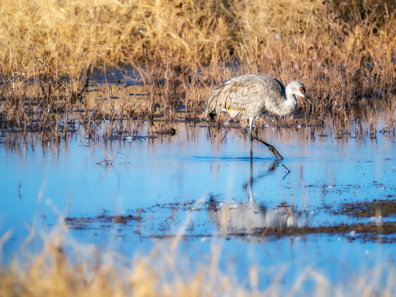 A long lens can be a great help in singling out a Sandhill Crane for an entirely different look. Keep scanning the area to find a single or a pair of cranes to photograph for an entirely different feel of mood. Finding vignettes within the hoards can help tell the story yet still be part of capturing behavior.