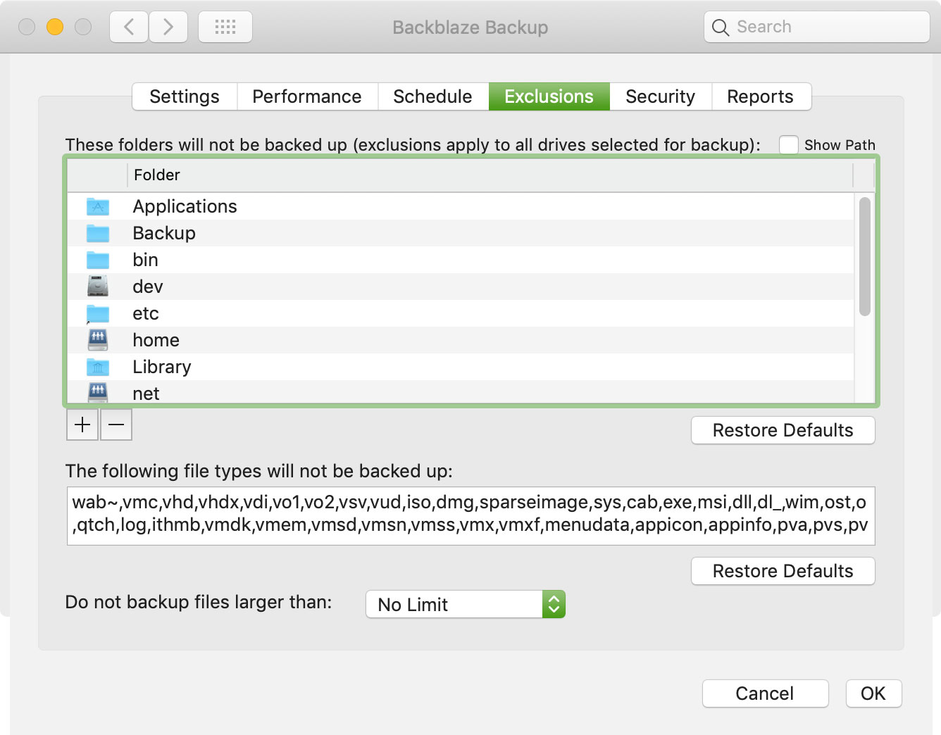 Out of the box, Backblaze is set up to backup your entire system, and there’s no easy way to turn that off. When I went into Settings and clicked General, I started by checking my Drobo and Samsung SSD for backup. Then I went over to the Exclusions tab to customize it even more.