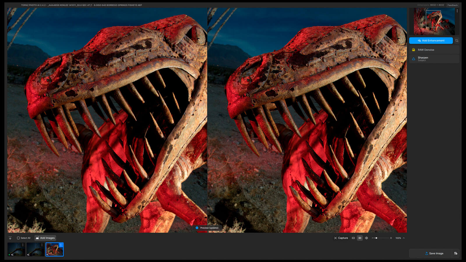 If you compare the sharpening in general to the RAW files, you’ll notice that the details aren’t identical. And you’ll notice that the details aren’t identical between each sharpening software either. The sharpening software with each of these programs is essentially making an educated guess, based on machine learning, as to what should go there. This approach is considerably more obvious with the Mobius Arch photo, which is why I chose this photo to share with you. There’s more “interpretation” with the texture of the rocks than there is with the better-defined sculpture of the dinosaur.