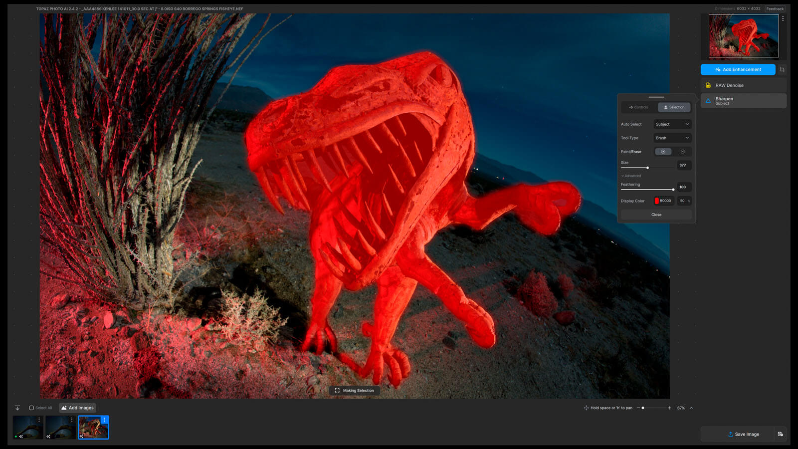 The Mask AI feature offered some choices, none of them, not surprisingly, a dinosaur. “Architecture” was the closest. I then used a brush to add to the rest of the mask so I would only sharpen the sculpture and nothing else.