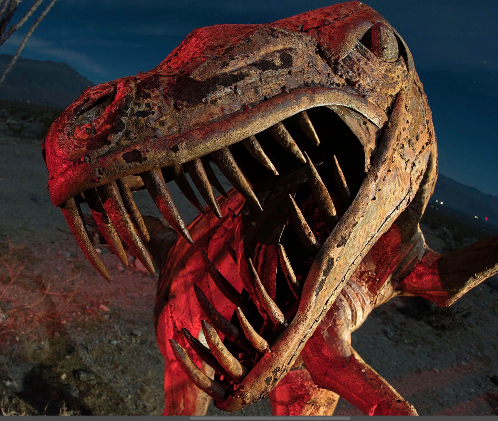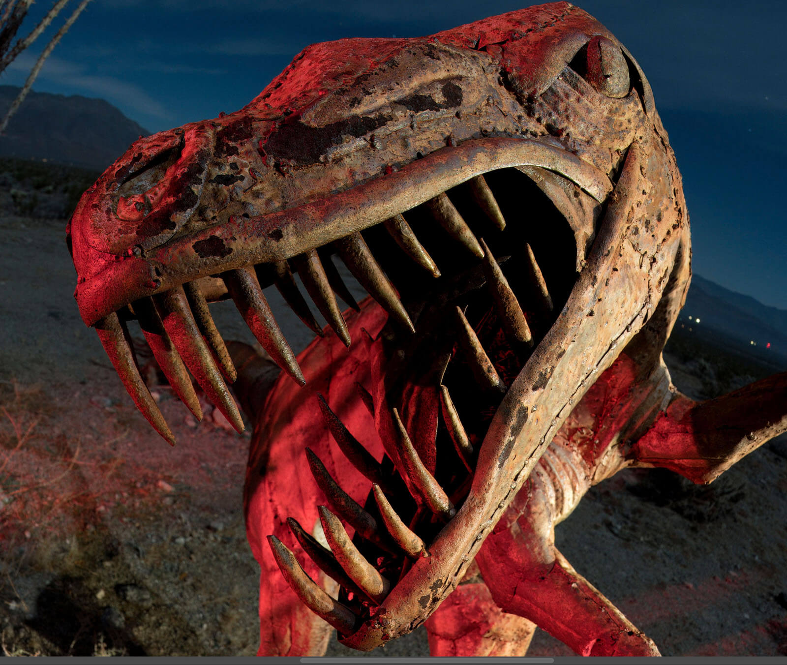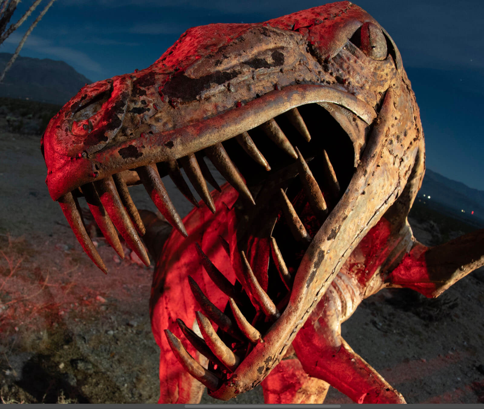 Sharpening software companies frequently like to advertise how great they work with birds. And with the feathery plumes and eyes, it does give a lot for sharpening software to sense. But I was wondering how it would work with night photos where part of the image was out of focus. I did two comparisons: one with a sculpture of a velociraptor in Borrego Springs, CA, and another with an old photo of Mobius Arch in Alabama Hills, CA.
