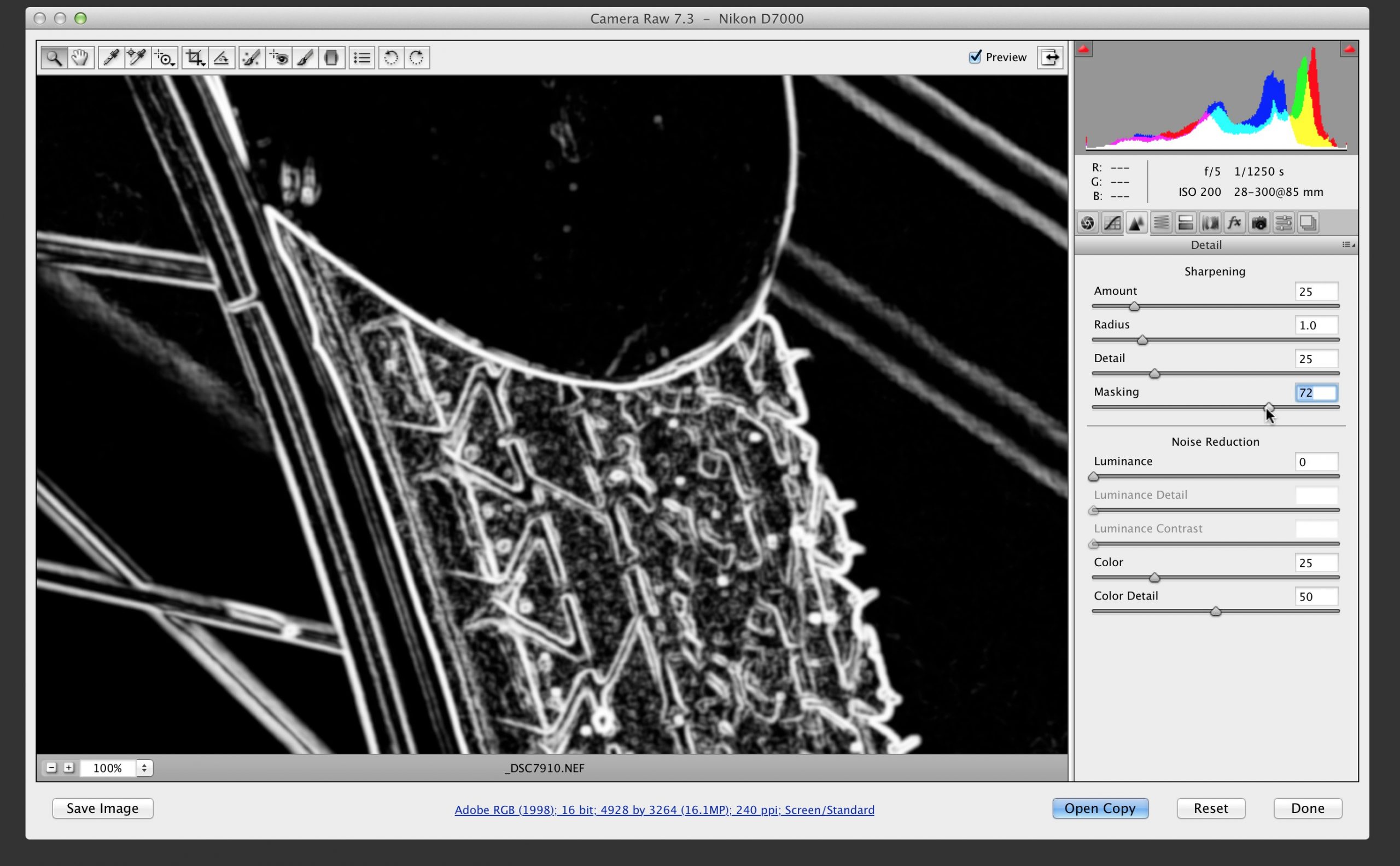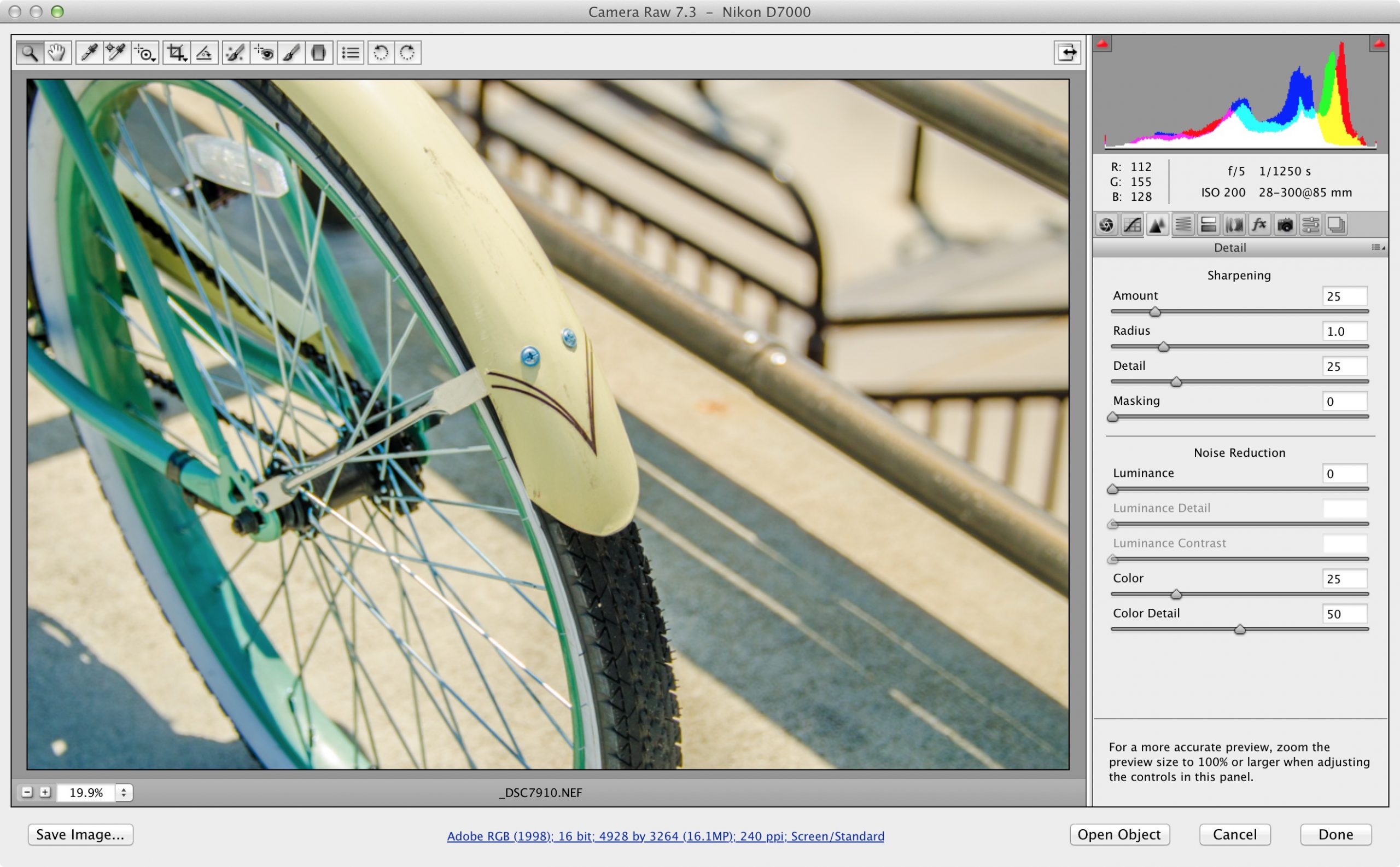 When working with the Camera Raw dialog, you should always take the time to switch over to the Detail tab. Here you can take precise control over both sharpening and reducing noise.