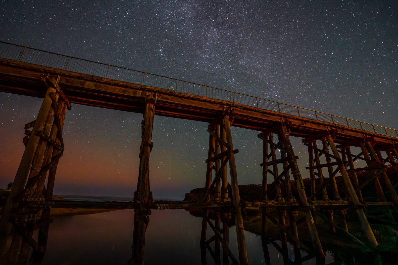 We headed to the Southernmost tip of mainland Australia (Victoria) closest to where we live. Flinders. Although we could have gone to various locations around the Mornington Peninsula. We need to head South to catch the action, but we also wanted to get as far away from light pollution as we could. We stayed here for a couple of hours and then moved to another spot much further along. We had an interesting foreground with the old Kilcunda Bridge, but the Aurora had faded off and we had a lot of light pollution.