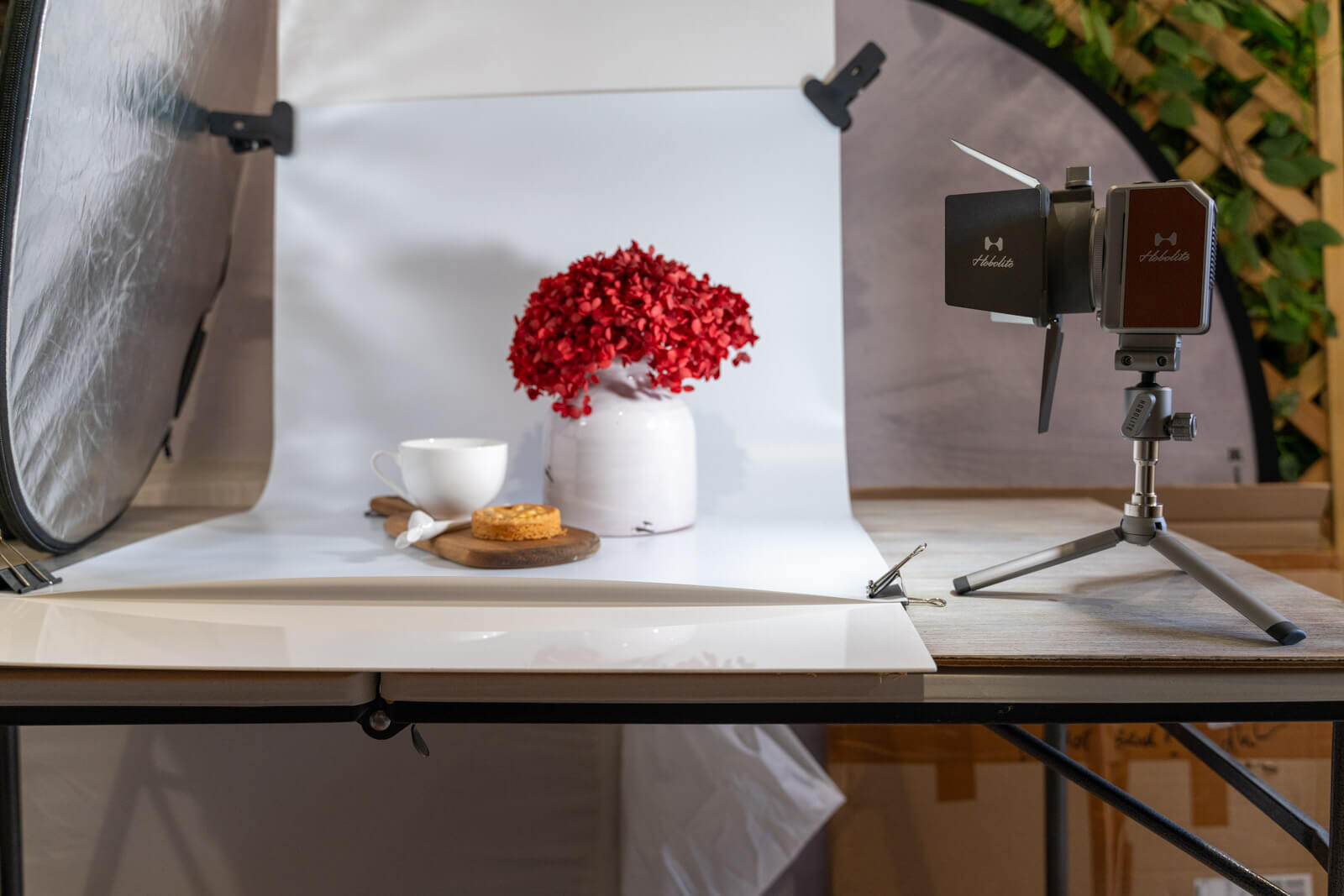 I used a white backdrop and placed a small coffee cup, saucer and spoon on a timber trivet, with some red flowers (to match the strawberries) in a white ceramic vase. I also did some shots without the coffee cup and just five of the tarts. Finally, I placed the Hobolite mini on the right and a silver reflector on the left.
