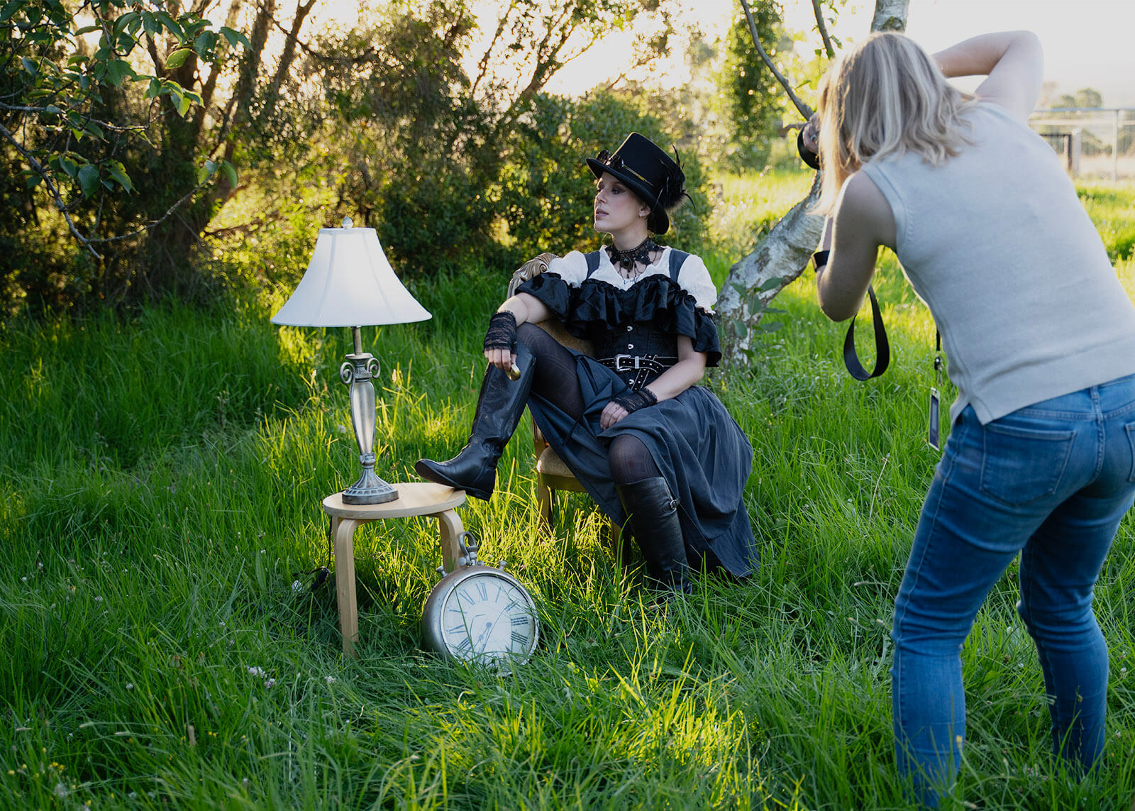 I recently ran a Western Steampunk Photoshoot/Workshop at Longwarry Hill farm in Longwarry (Victoria, Australia). We planned the whole thing late in the day to culminate as the sun was setting. We took a chair and a small table, along with my lamp into one of the fields. Still in deep shade, but just catching the rays of the setting sun.
