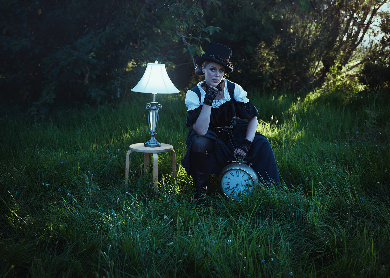 My model for this shoot was Charley in a steampunk outfit, complete with a top hat. I got her to sit on the chair and with a variety of poses, lit with the fading sun and my lamp. The giant clock/fob watch was a last-minute add-on. Isn’t it just perfect?
