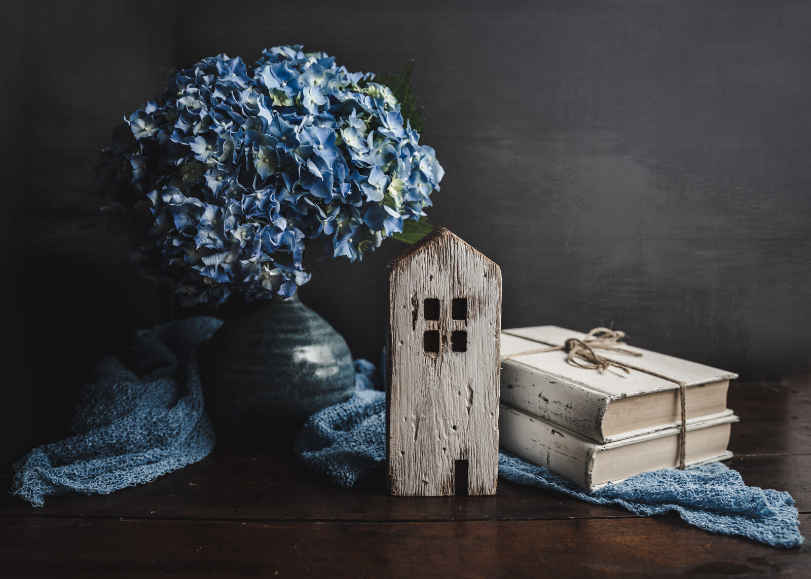In the below image, I draw the viewer’s eye in with the blue fabric on the left and up through the flowers to the little wooden house (my focus point) and then to the books and off to the bottom right, again with the blue fabric.