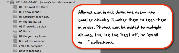 The easiest way to break a big project into bite-sized chunks it to create albums. Lets say you took a long holiday and visited the beach, a museum, took a neighborhood tour, etc. It can be handy to separate those events, but not actually move them to different projects. This vacation was all one trip, or project, after all. So you can create an album for each sub-set, or event, or however you like to think of it, and put photos there. Whats great is that you will still see all the photos from that trip whenever you click on the trip project, but when you want to just see the photos from the museum for example, you can view only that album. The same photo can appear in multiple albums, too. Following the above example, you may have every photo in an event album, but then make another album called best of and just drag your favorites into there. They will still show up in the project and the original album, and also in the best of album.