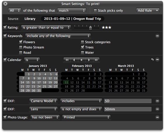 If you want to get really specific, you can apply individual keywords to photos or groups of photos. Once those are applied, you can create complex search criteria to find exactly the photos you want. You can search on the fly, or create a Smart Album that will re-search your photos every time you click on it. Its easy to create a search to find, for example, photos of trees or flowers shot in January with your Canon 5D Mk II and 50mm lens rated 3-stars or better that haven’t yet been printed.