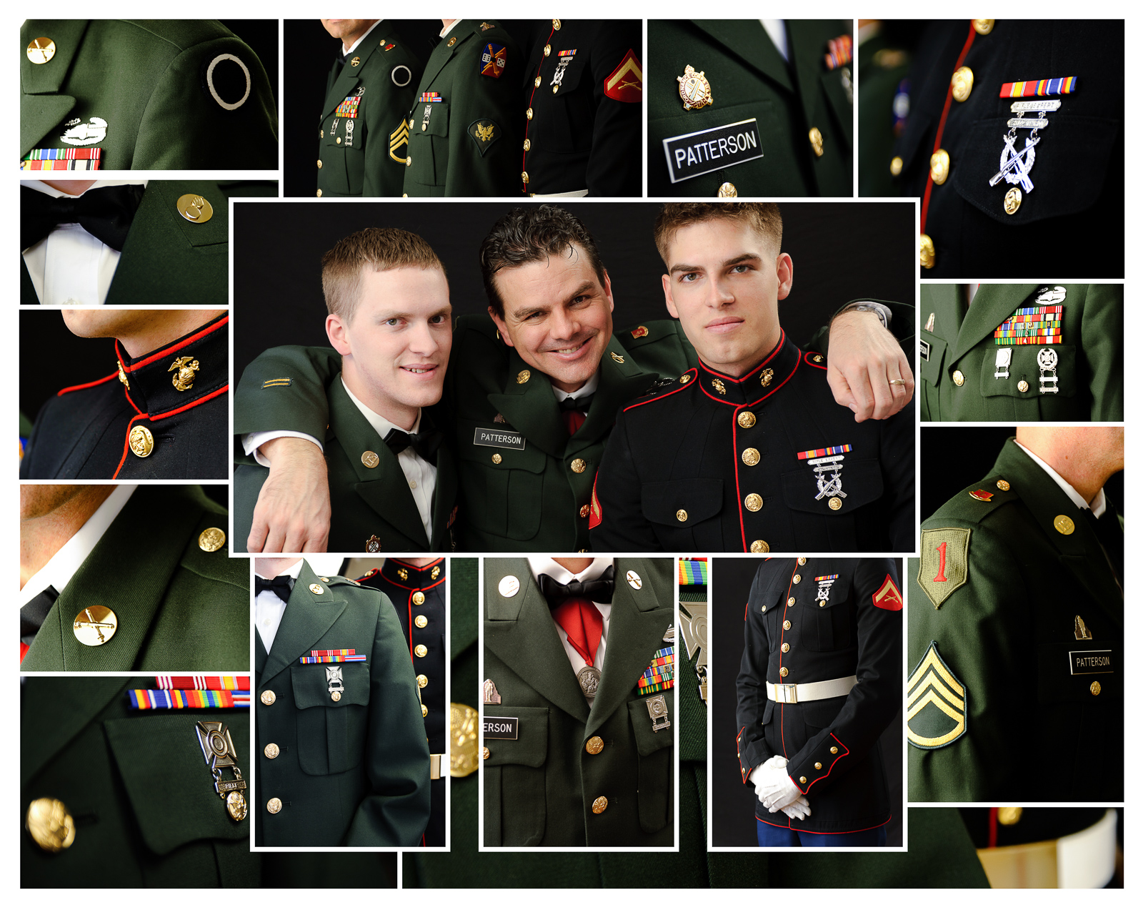 In this case, the details that go into this group are plain to see. Father and sons have all served in the military but in various branches and roles. Since this portrait was made, the younger son has also served in the Air Force. Their uniforms illustrate what that work has been. Photographing the details helps paint a picture of their heritage.