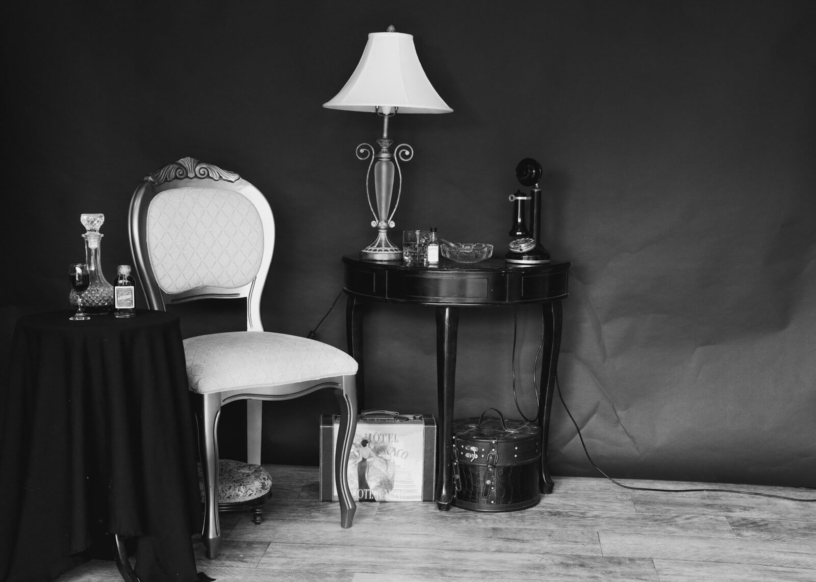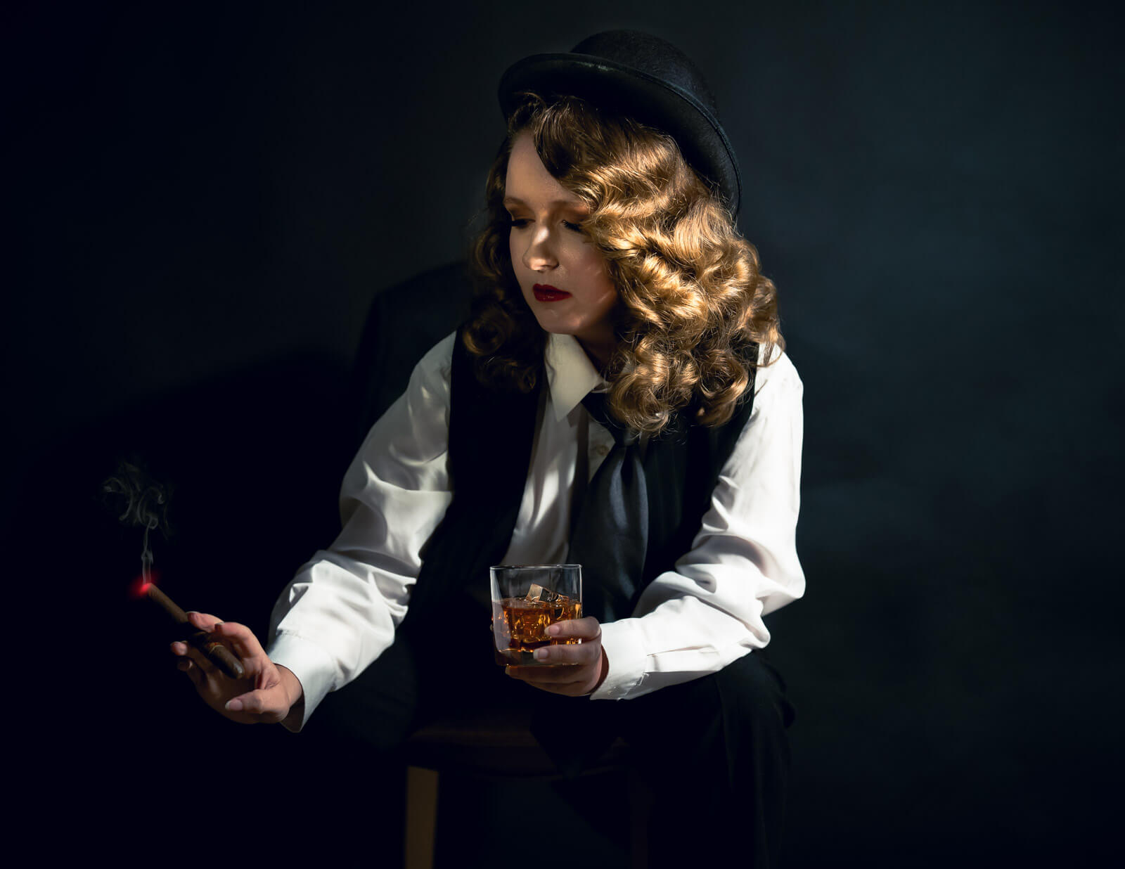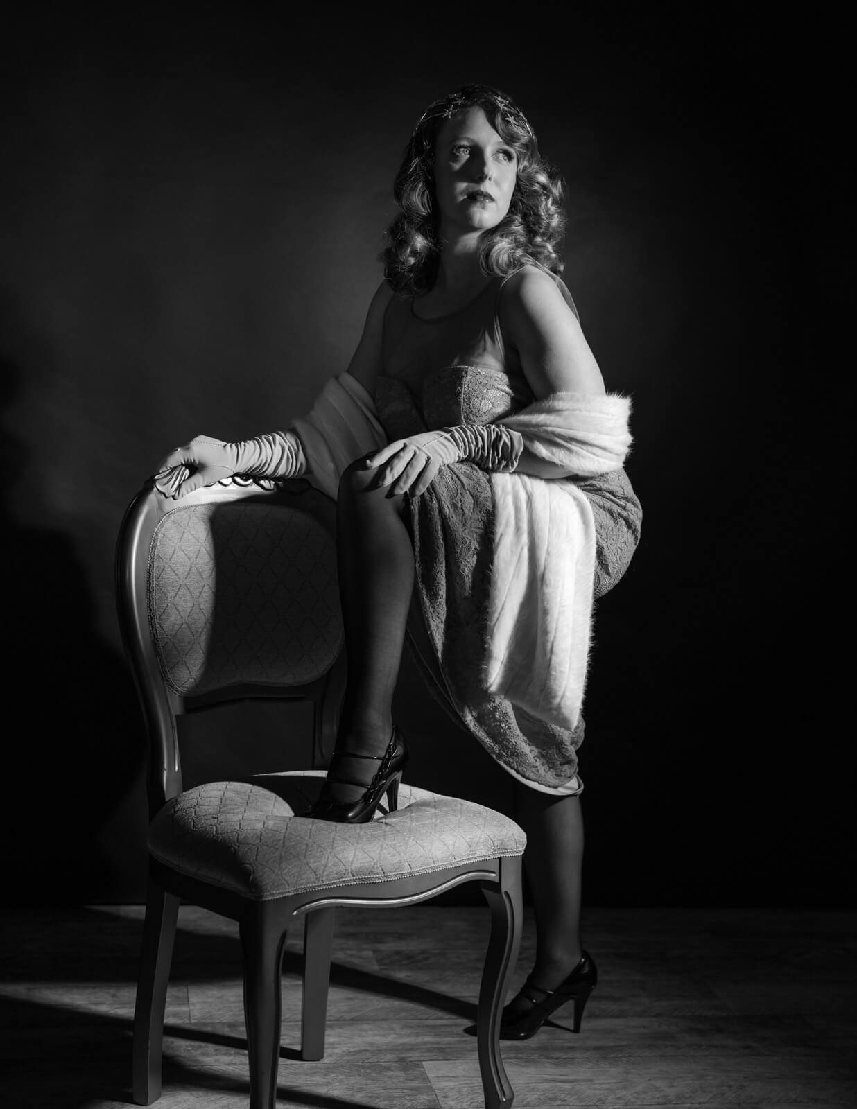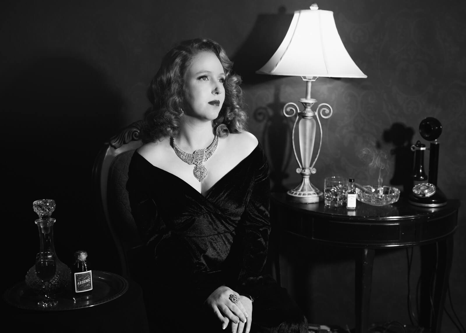 The choice of location plays a significant role in Film Noir portraits. Urban environments with dramatic architecture, narrow alleys, and dimly lit cafes can set the stage for your portraits. Consider how the setting can become an active part of the narrative. But you can fake it til you make it, as they say. I often shoot in the studio and use a black seamless paper background, adding a chair, a side table, and a few props. Lamps, ashtrays, and more. It can be as simple as a single chair.