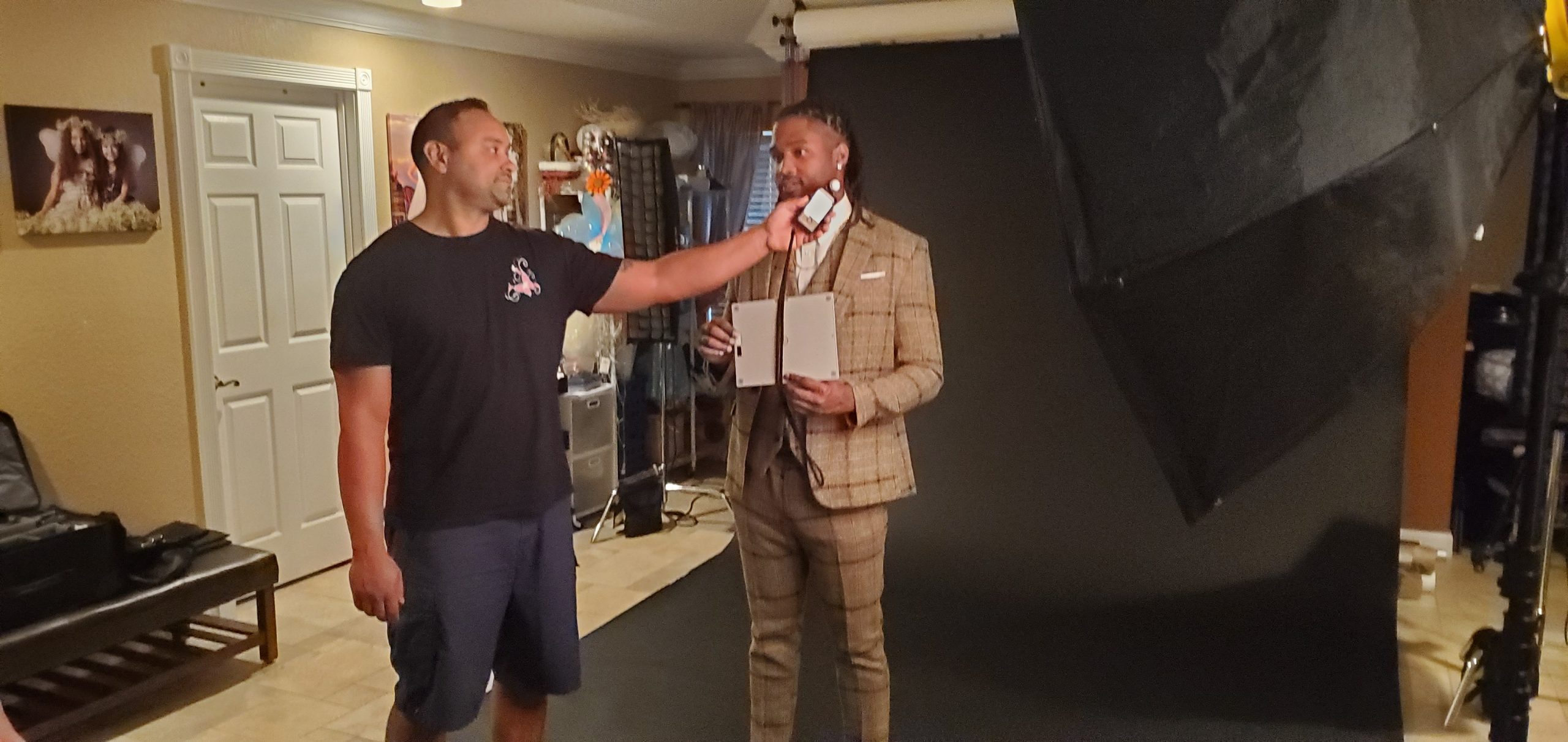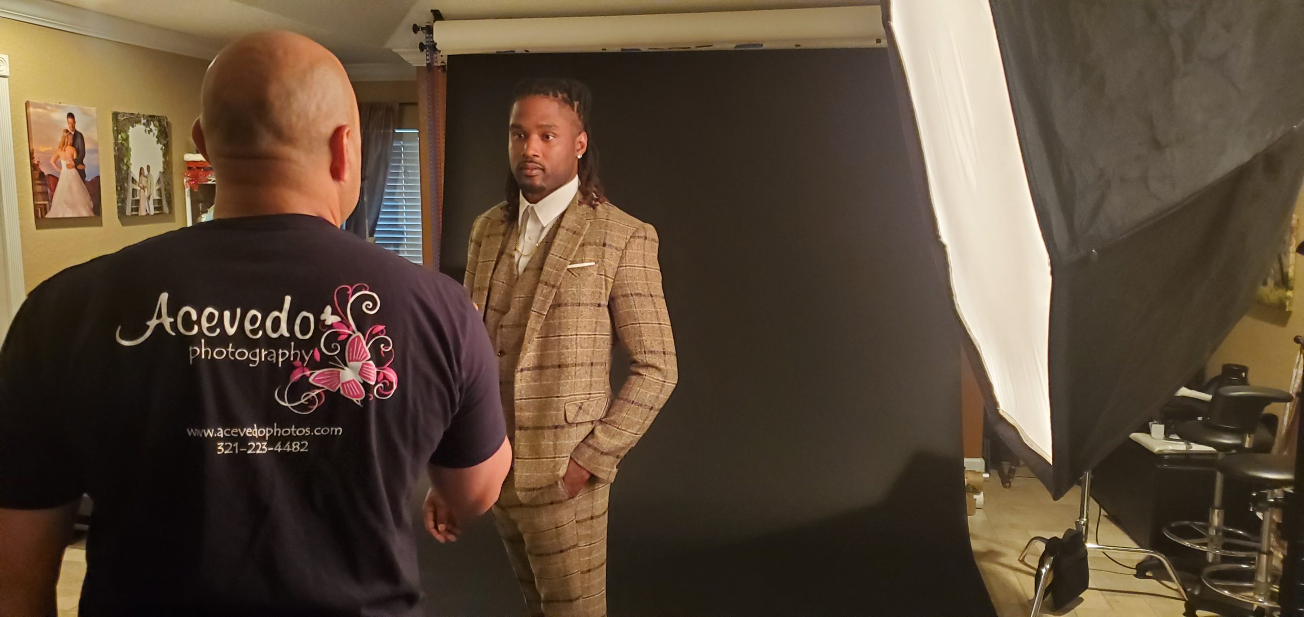 Place your subject and yourself at a 90-degree angle. You want the light to only be hitting your subject at a 90-degree angle. This helps to create the look of only one side of your subject’s face having light and the other in a deep shadow.