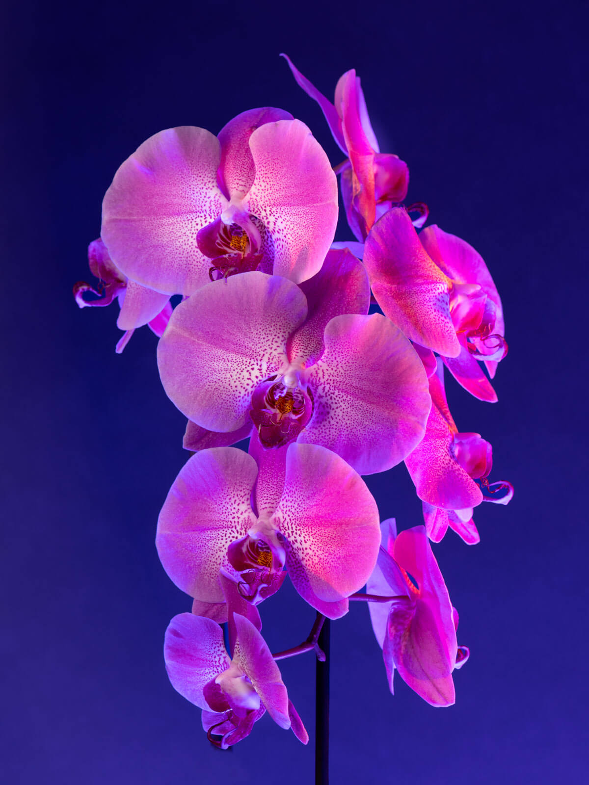 To light this baby up, I used Falcon Eyes F7 LED light panels. Not having to worry about unexpected breezes spoiling the image, I didn’t have to have a lot of power. Three 12 watt lights were used. Because light panels are relatively small I added a Westcott 20 inch scrim from the 5 in 1 reflector. Nestling the scrim close to the orchid has the effect of making the light source be large in relation to the subject resulting in soft shadow edge transitions. Below is the final pick after tweaking the lights and scrim in a few different combinations of distance and brightness. The background was lit with 4 foot Nanlight to give color and a slight gradient.