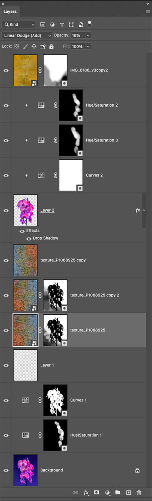 Lay a texture layer over the subject and cycle through the Blend Modes. Stop when you see one you like. If there is some thing close but too strong you can lower the opacity. Add another texture and repeat until you are getting a look that speaks to you. If an effect is looking good but has a blemish or line you don’t are for you can use the Clone Stamp Tool to adjust.