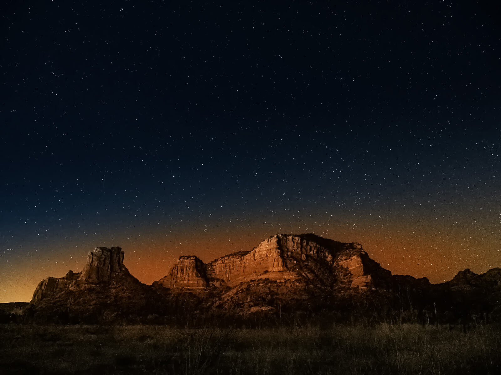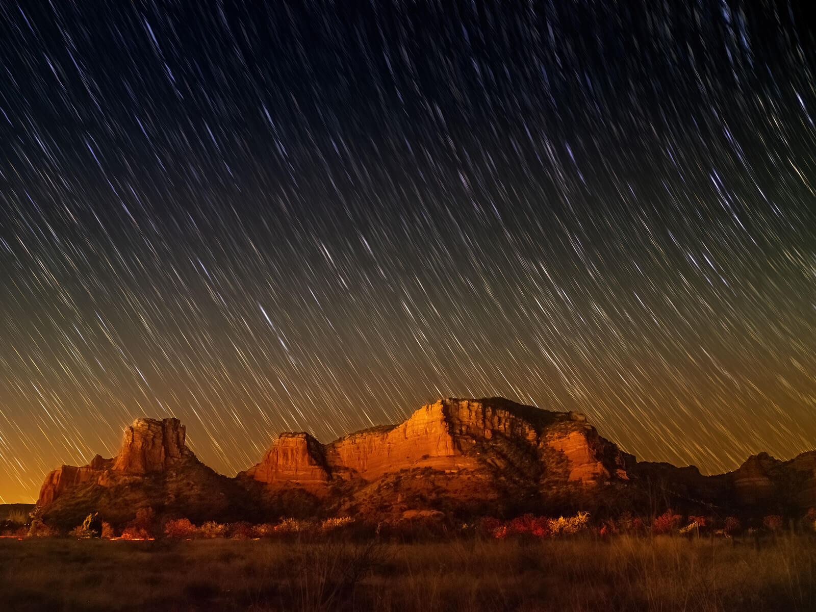 The second camera looked to the western sky. When you point the camera away from the Earth’s poles the stars take a different turn. In this case, I couldn’t use the Olympus’ camera feature of LIVE COMP which records only new light information as the exposure is made. Instead, I decided to capture a time-lapse sequence with which to blend the new light showing the passage of time. Why? Because there was a road with traffic between me and the red rocks. The constant light recording would have caused overexposure along the highway.