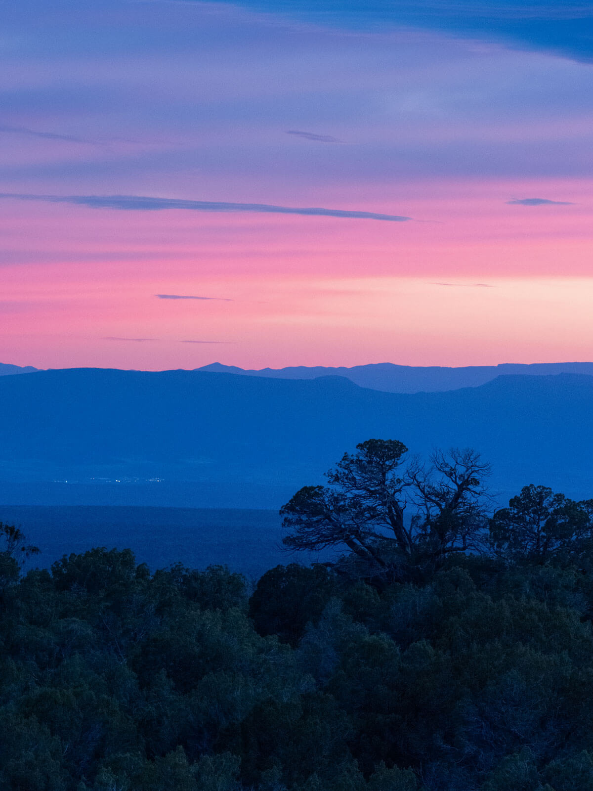 The clouds are nicely layered with multiple colors. In the foreground I am blessed with trees in silhouette against the blue mountains. Having a relatively long lens also allowed to isolate a single tree with a great shape above the line. Aha! A subject to with which to work in front of the pastel colored sky. That’ll work!