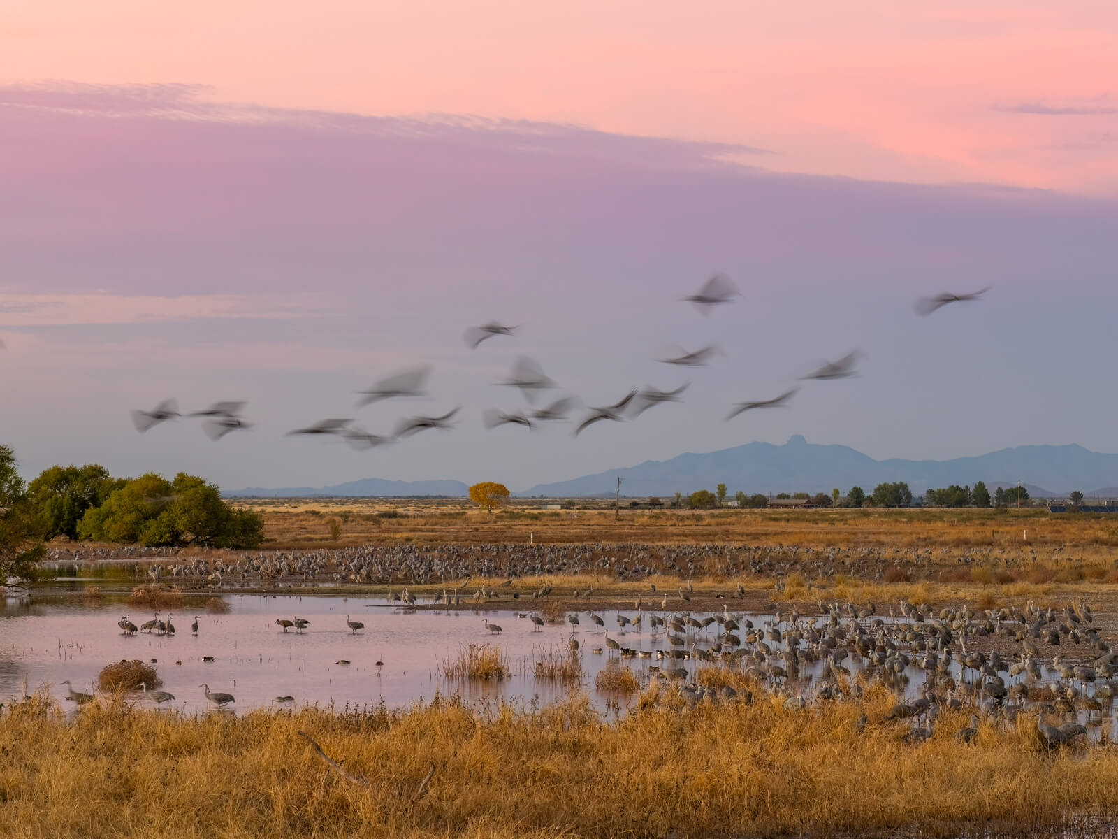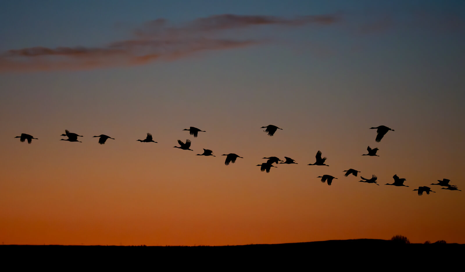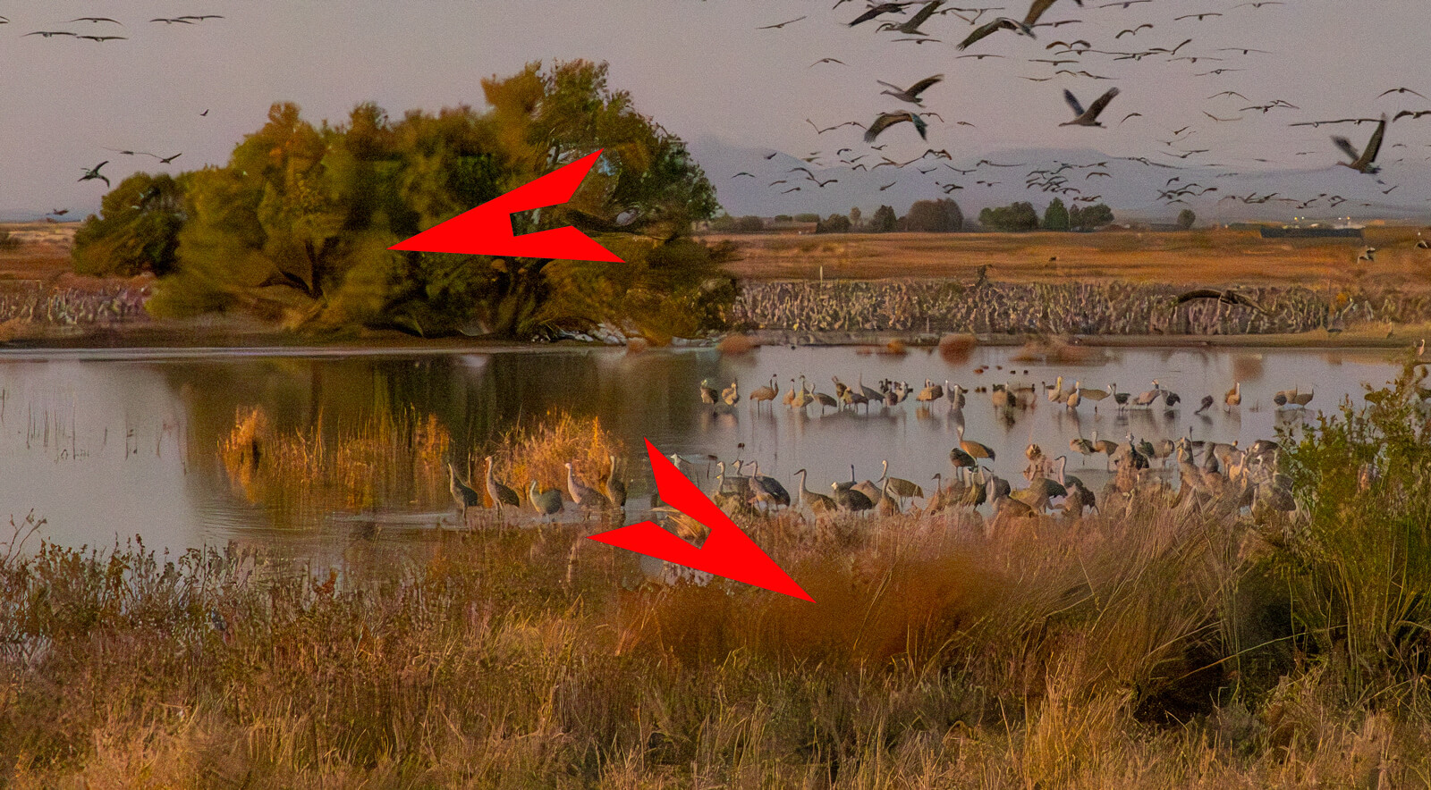 There are only so many photos you can make of the cranes making their approach over the previous returnees. Which means it’s time to play and push the envelope of capture. In my case for this night it was high ISO. But that’s not all. Mix in some slow shutter speed and things can change radically. I really enjoy the combination of the static scene and birds on the ground and the blurring of the cranes flying in.