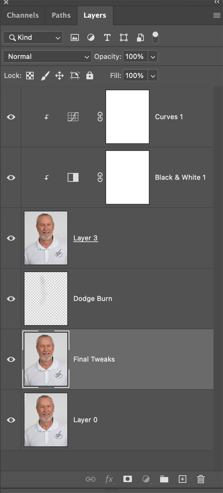 For myself, as well as my clients, I do a conversion to black and white, so there is good contrast. Many times if you send off a color image that will be converted to BW, all that is done a desaturation which results in a milky black and white. In this case I used Photoshop’s Black and White adjustment layer and added a little contrast with a Curves adjustment layer.