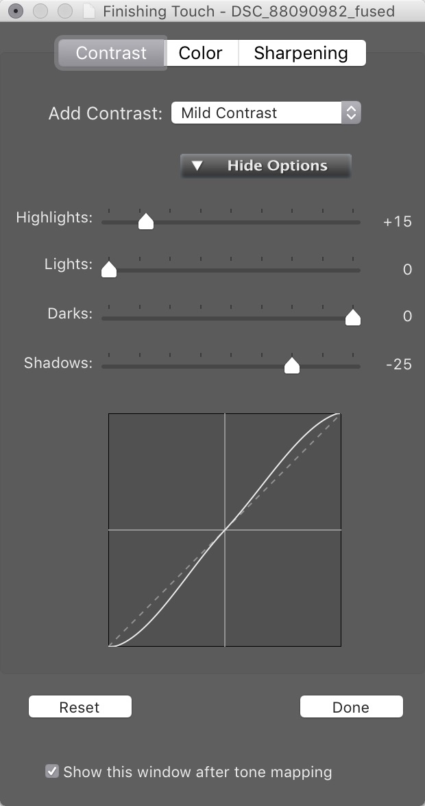 After you click Apply, the image is handed off for finishing touches. Here you can take things a bit further to stylize the image. I suggest adding a bit of a curve and some sharpening. If you’re an Adobe user, you can also choose to open the file in Photoshop or import back into Lightroom for some extra touches or cleanup. Sometimes HDR workflow will bring out any dust or lens spots. I’m always a suck for using the gradient maps in Photoshop.