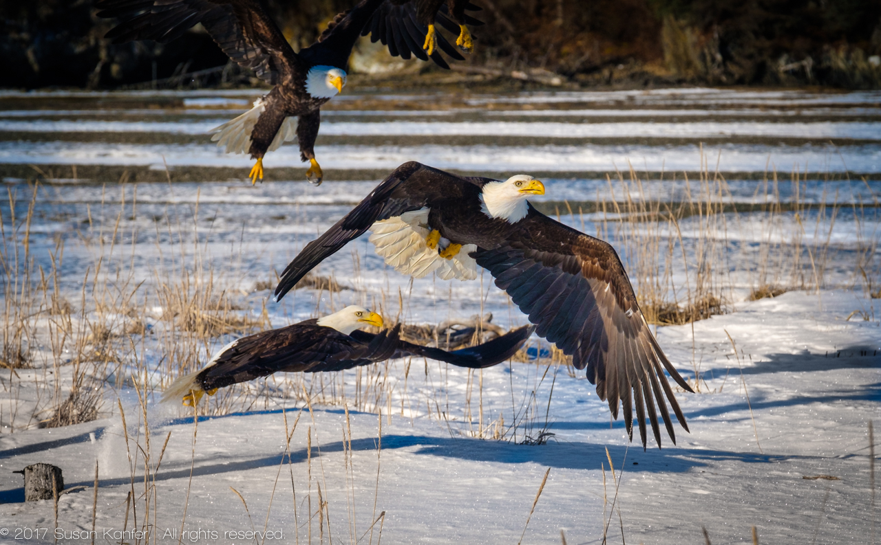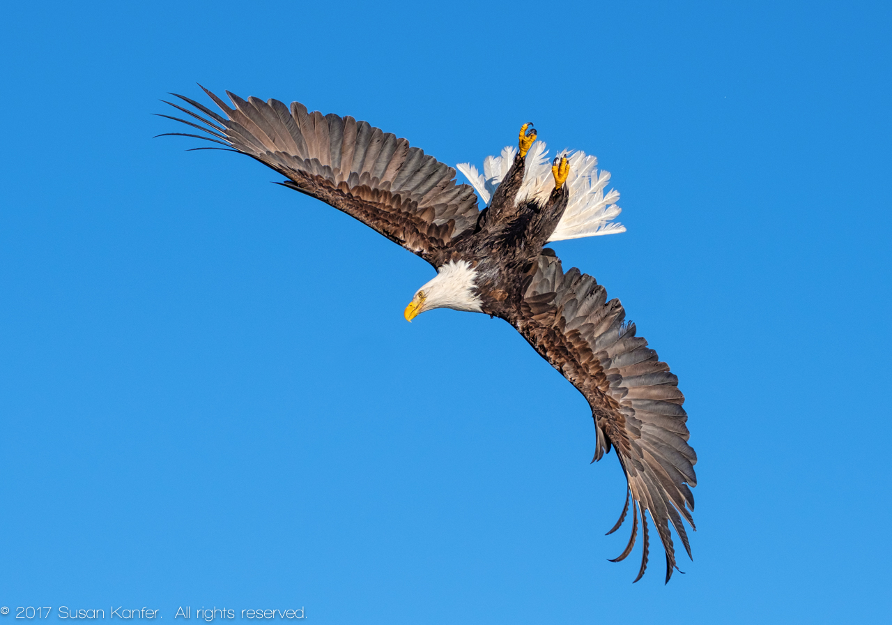 I also set my exposure manually so that I will be certain that my highlights will not be blown out by an automatic setting. For example, when I photographed bald eagles in Alaska I set my exposure for the white feathers on the eagles’ heads, looking for “blinkies” on the head feathers as I reviewed initial images on my LCD screen or checking my histogram to be sure I wasn’t clipping highlights. (There should be no blinkies and the histogram shouldn’t creep up the right side. If there are blinkies or if the histogram is creeping, decrease the exposure until there are no blinkies and the creeping stops.) I also periodically re-check some images as the photoshoot continues, to determine if I need to make any exposure adjustments.
