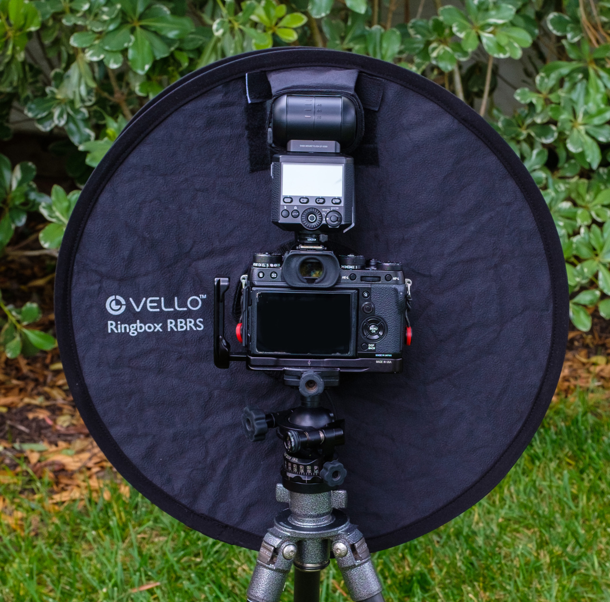 When attaching a ringbox like the Vello Ringbox first position your on-camera flash into the top opening of the ringbox, through the velcro loop and tightened the loop. Use the provided velcro masking strip to cover any gap in the flash opening of the ring box. It is recommended to mask across the top of the gap for a flash with a short body and across the bottom for a flash with a long body. Insert your camera lens into the lower opening of the ringbox, pulling the cord tight around it. Always double-check to be certain the flash is securely fastened to the camera and the camera to the tripod.