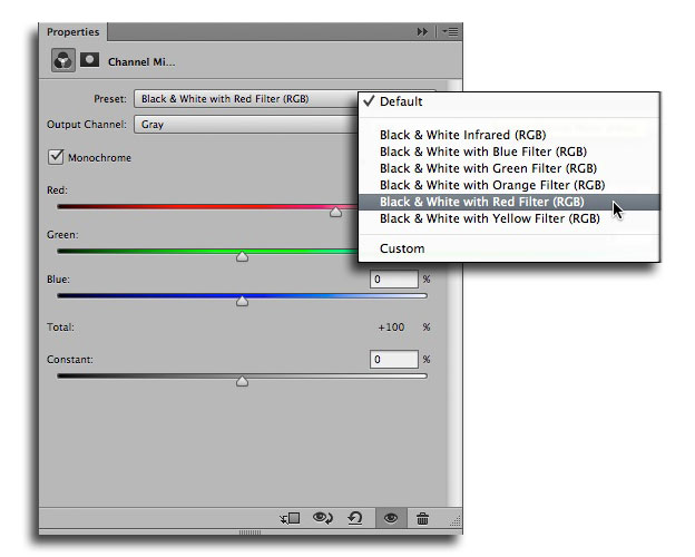 At this point, most would stop and call this image done, as good as its going to get, but doing so would miss out on the full potential for the image rendering. We could perhaps push the saturation a bit more, but I prefer to be conservative here because it’s so easy to add more color later on. The next step, after opening in Photoshop, is to examine the individual channels to see if any one channel has a better tonal rendering as far as contrast and detail. Most of the time, with landscapes like this, the red channel looks better overall. So… let’s turn the image into a B&W rendering using the red channel – apply a Channel Mixer adjustment layer…