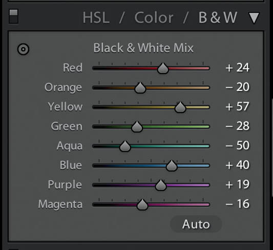 Using the Black & White treatment option in Adobe Photoshop Lightroom’s Basic panel (found in the Develop module or a Black & White adjustment layer in Photoshop, you can manipulate the conversion for each color separately, allowing for some dramatic variations of a single image.