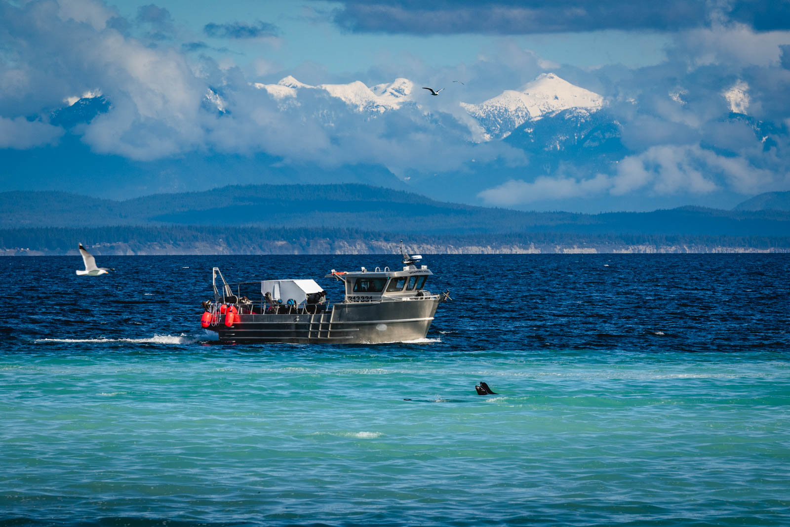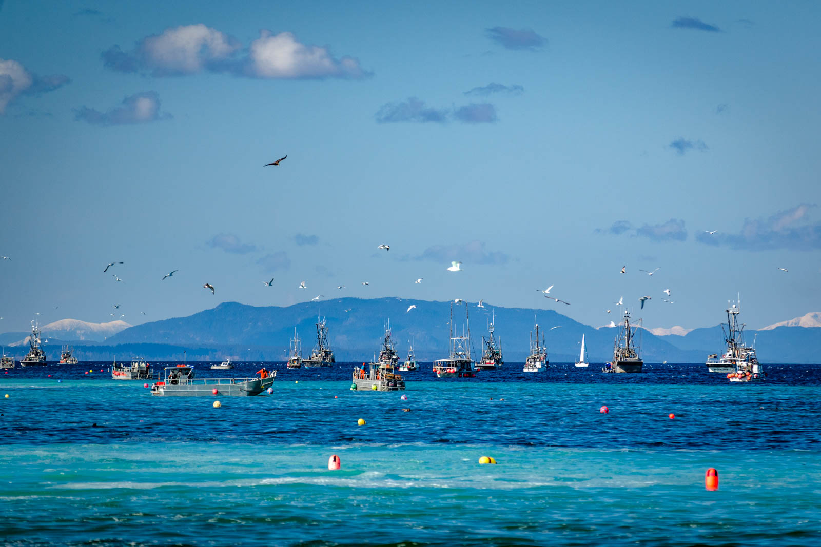 At this time, the females’ eggs (roe) are at their peak maturity. The male herring release their sperm (milt) into the water to fertilize the released roe. This creates a stunning turquoise color in the ocean. The process happens over the course of a few days, moving locations as the herring travel. During this time, there is a veritable bonanza in terms of wildlife, commercial fishing and of course, photo opportunities!