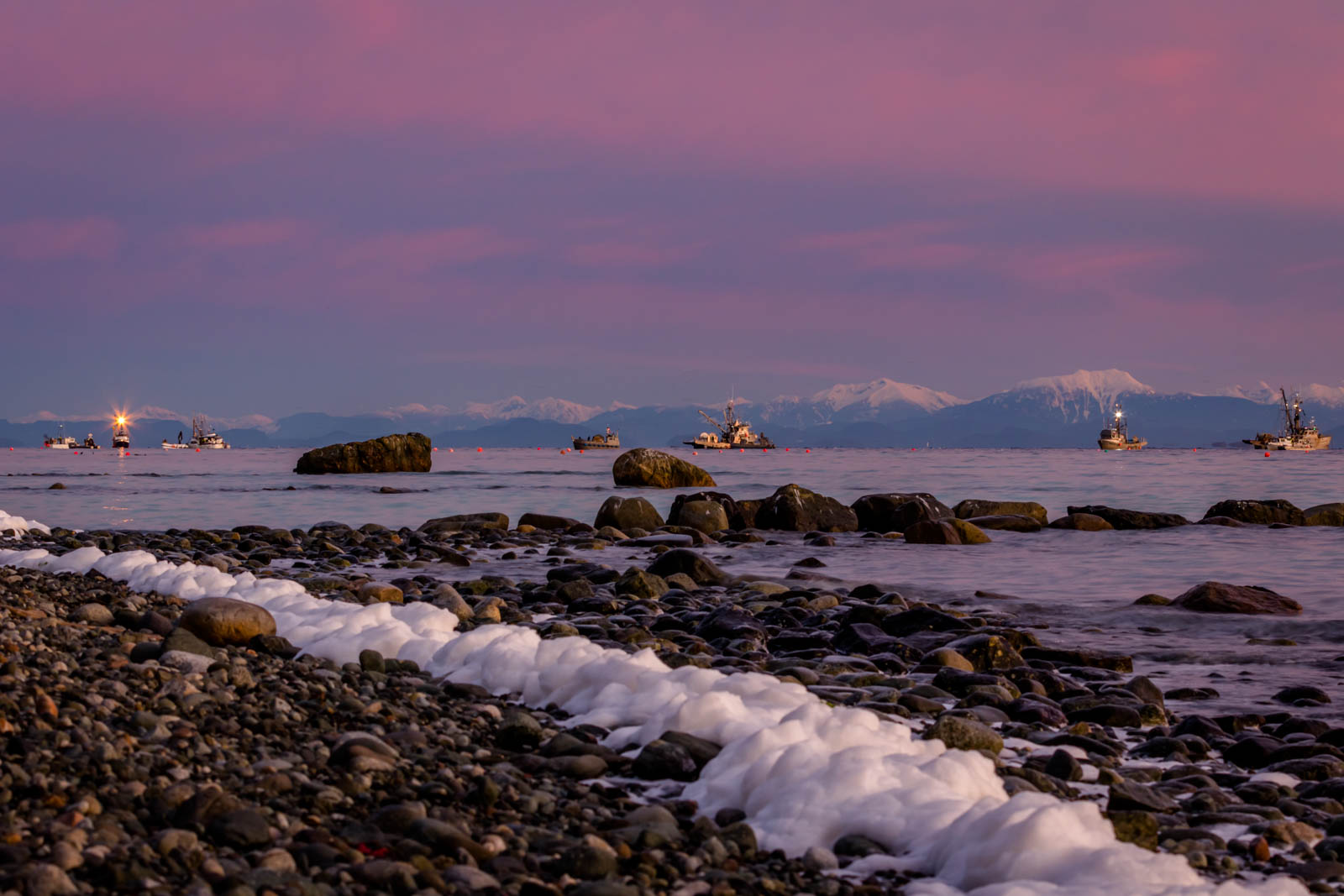 Bleary eyed, I arrived at the beach the next morning well before dawn. Much to my delight, many of the boats had spent the night and were still working the waters. A line of thick foam covered the high tide line, remnants from the previous day’s activity in the water.