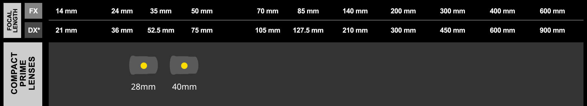The remaining four FX lenses are 28mm and 40mm compact prime lenses, a Micro 60mm macro lens and a 200-600mm telephoto zoom lens.