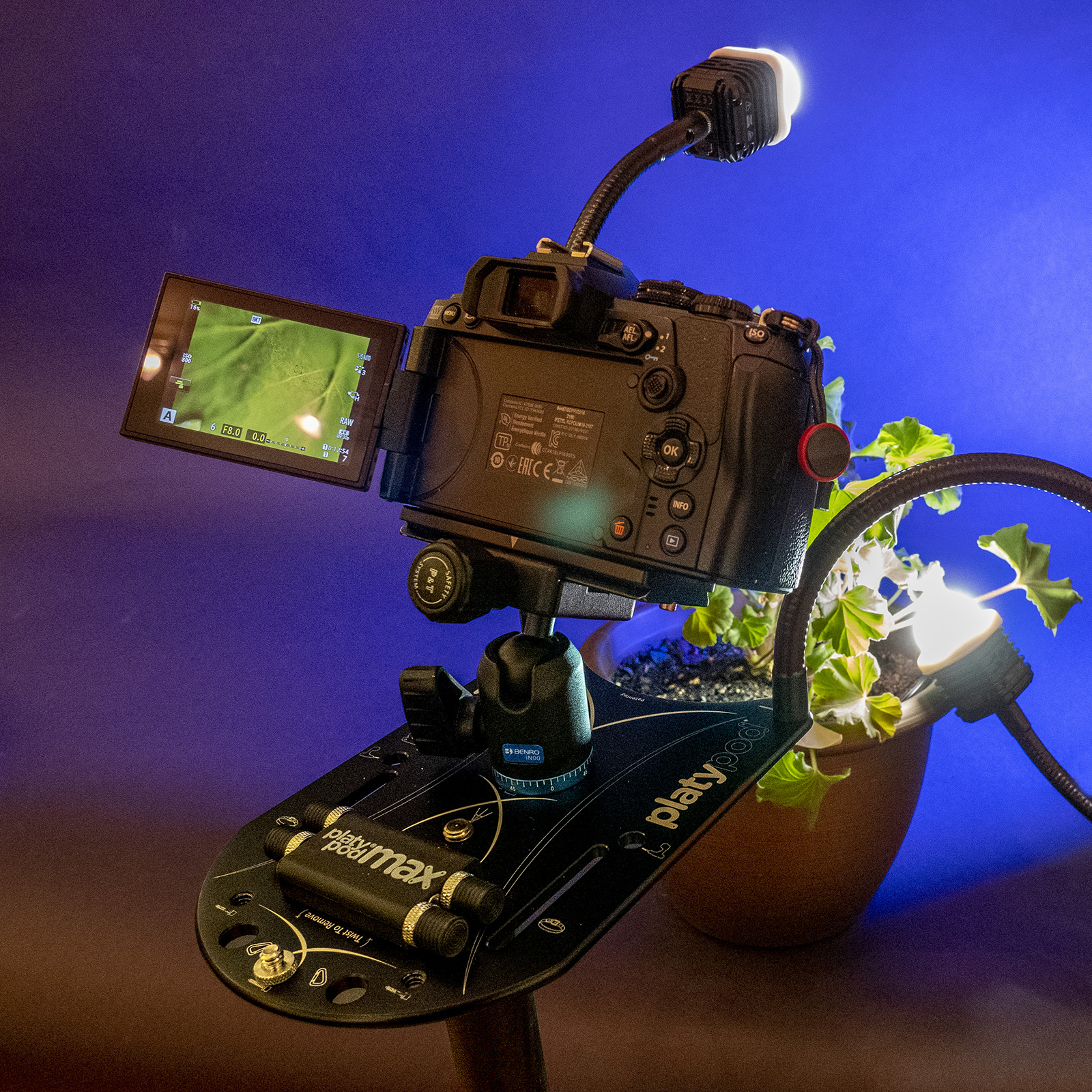 With my macro lens, I’ve found using a Platypod plate to be very handy. Mounted on top of a tripod makes this a snap. The machined plate allows for mounting the Platypod on the tripod, a head for the camera and goosenecks for the LED lights.