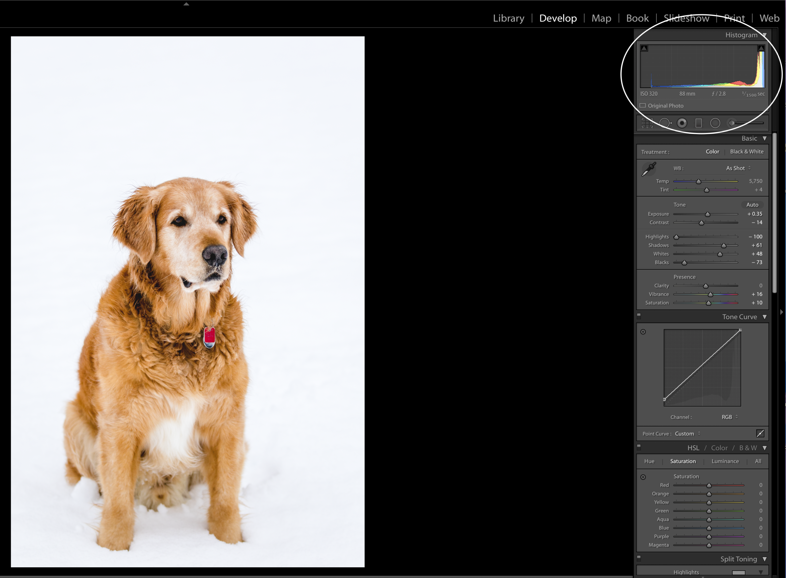 After you’ve composed your scene and compensated for the bright snow, make sure to check your histogram. A typical snow scene will be “exposed to the right,” which means most of your histogram information is on the right, or highlight side, of the histogram.