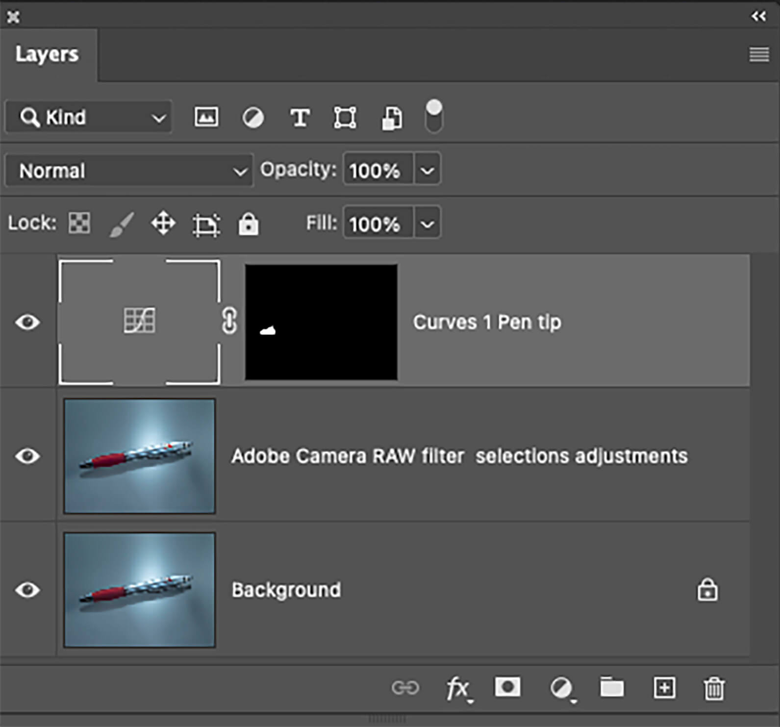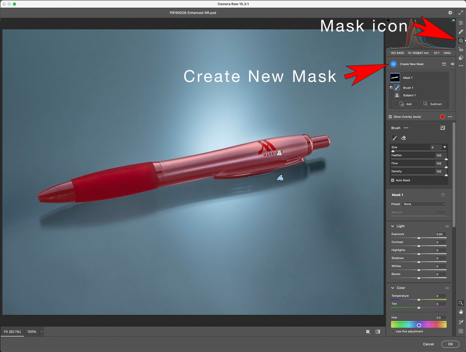 Following I made a copy of the base layer and opened it using Filter> Camera RAW Filter. Once in the filter, I moved to the Masks area. Various selections were made with different changes occurring only within the those selections. For example, there was an adjustment made with the pen only selection shown in the illustration. A Radial selection was also made to add a subtle spotlight over the Marriott logo. I’ve found the Camera RAW Filter extremely powerful when used in this manner.