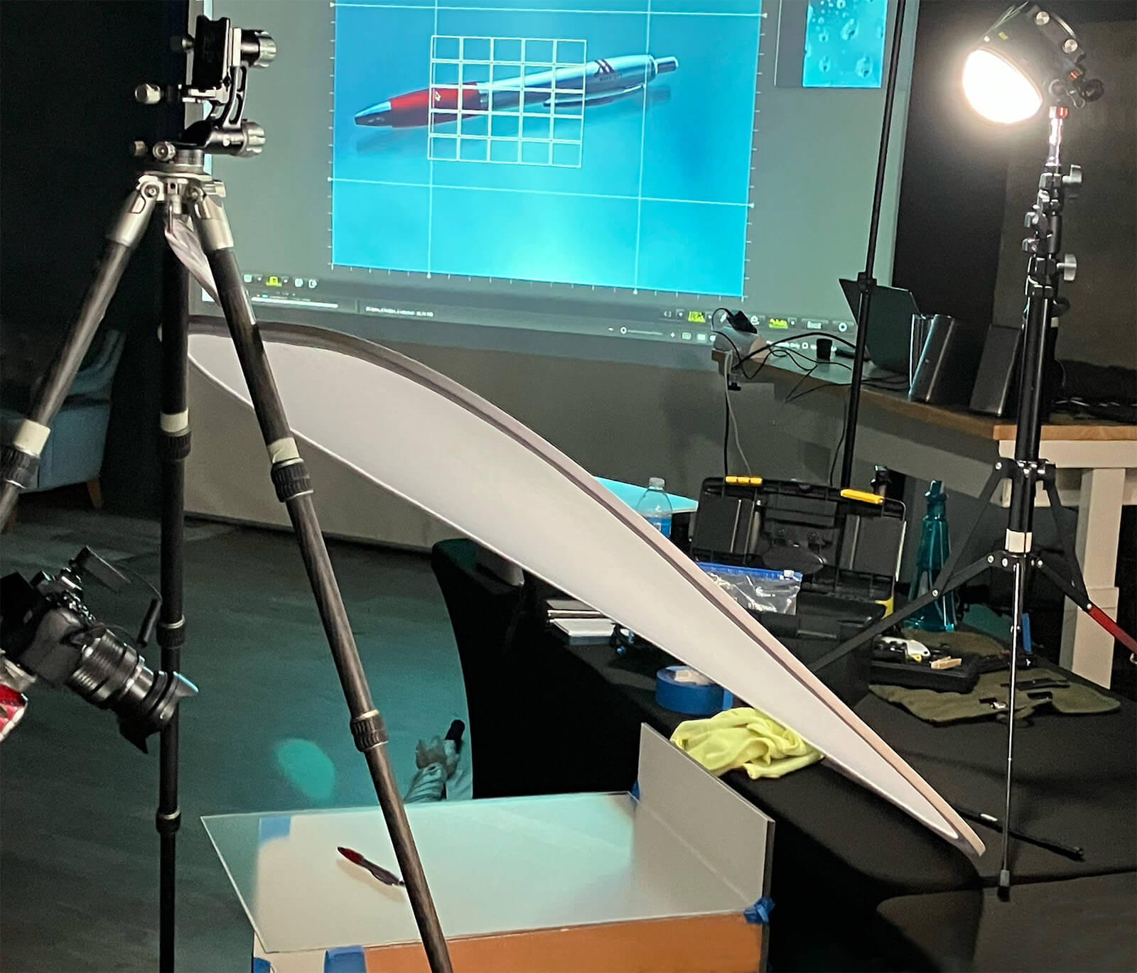 All of this is accomplished with a single light, scrim, non-glare glass, a reflector and a little Photoshop post-production. Non-glare glass is suspended over a white reflective surface. A white translucent scrim is tilted over the glass making the glass ‘read’ with the light and shadow. Light is created using a single Molus X100 COB light from Zhiyun. Here’s a link to my X-100 review. There is a small reflector on the light and a small modifier to help spread the light just a bit.