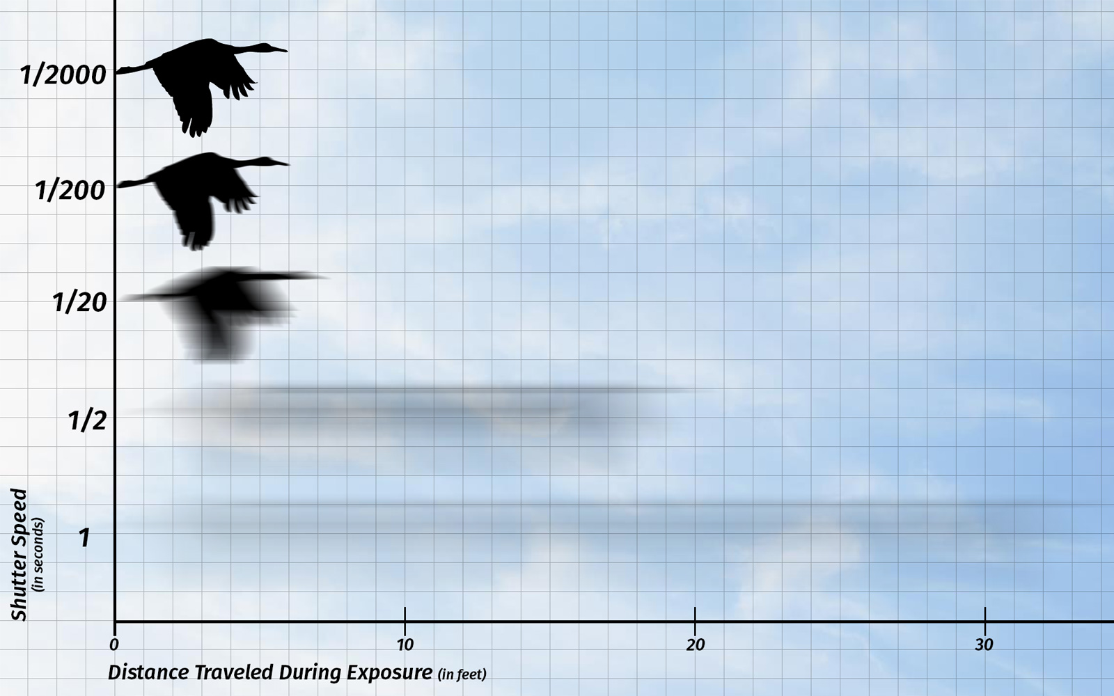This is where shutter speed becomes crucial. Let’s say that a sandhill crane flies across the scene in front of you. At long (slow) shutter speeds you are capturing that animal from the moment the shutter opens to the moment it closes. Any movement is perceived as blur, from the point it started in the frame to the point it ends up. If you have a 1 second shutter speed, and the camera is locked in position, you will have a streak of gray stretching 30 feet through your scene. If you use a high (fast) shutter speed, like 1/2000th of a second, you will freeze motion, as the sandhill doesn’t move very far in this amount of time, only about 1/8th of an inch.