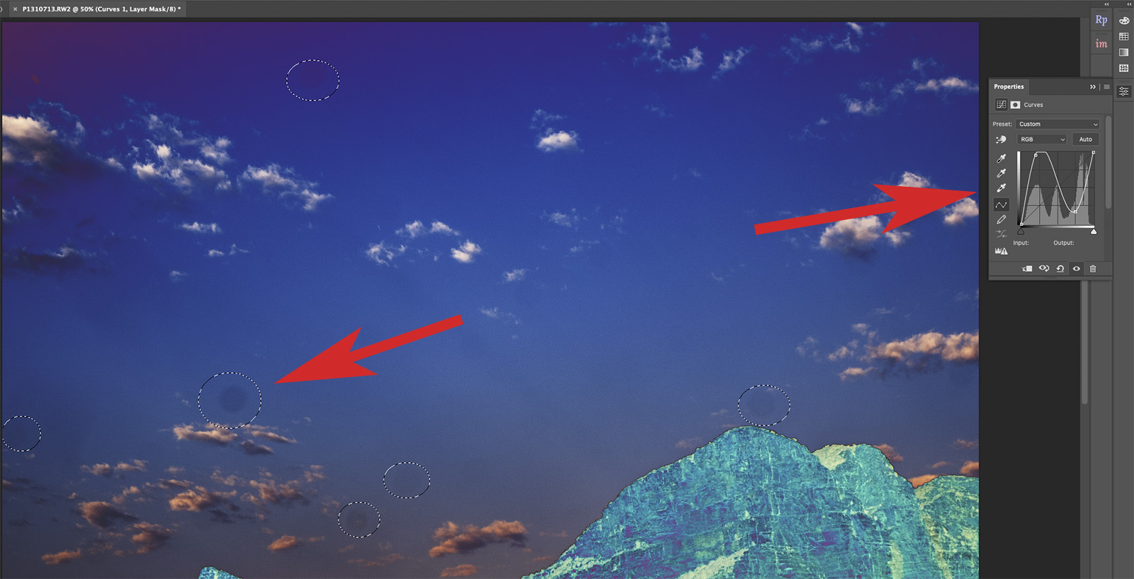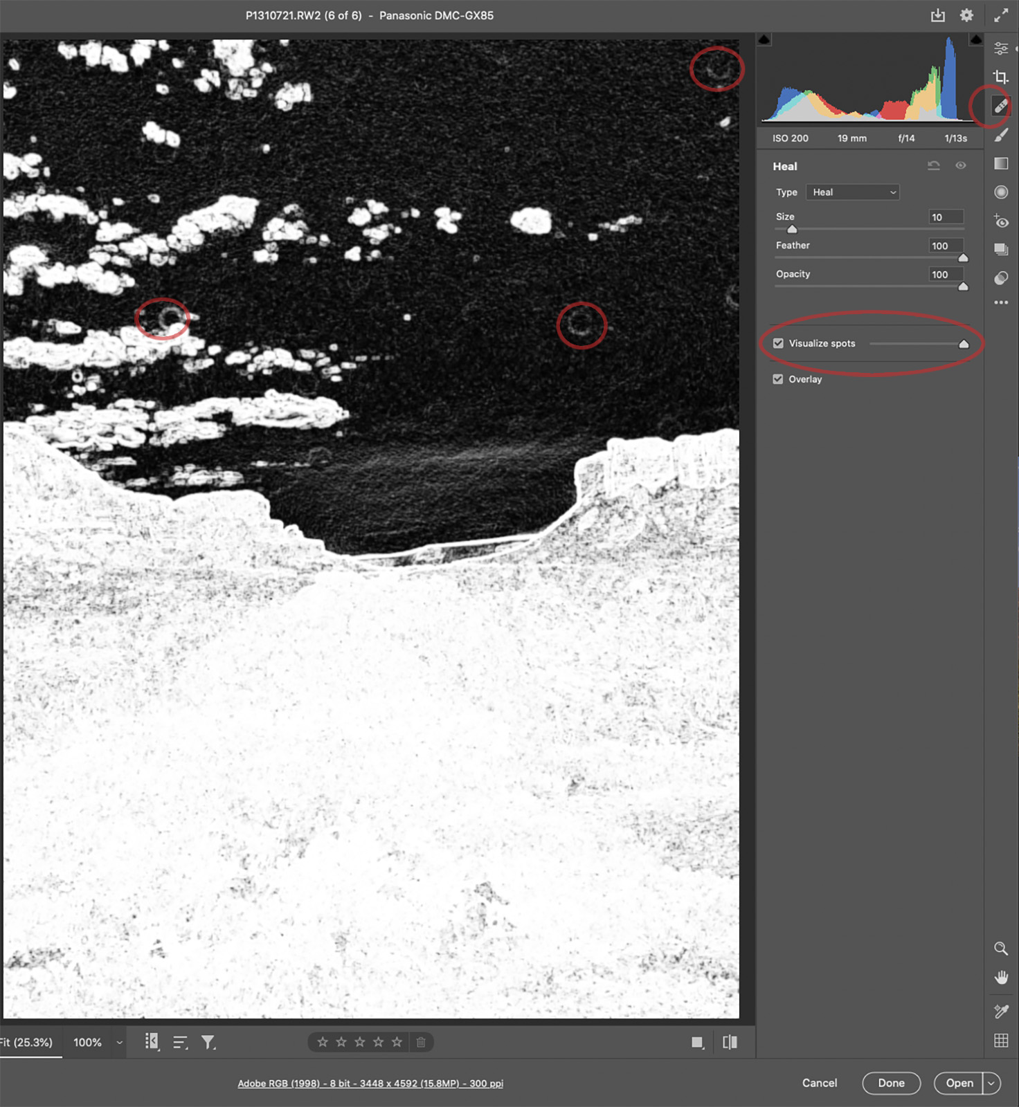 It’s a good idea to use extreme measures to find your dust spots. One such method is the Visualize Spots checkbox. It will create a high contrast visual that makes spots you didn’t know you have appear. You can also activate a Curves Layer to achieve a similar idea as I show below.