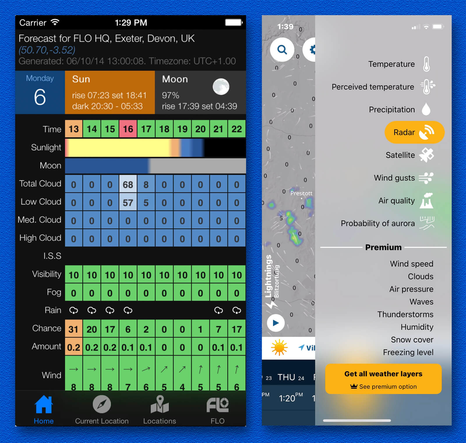 Ventusky is an app you can use for free with all the extra information you’ll need including Radar, Satellite images, temperature, wind directions and more. If you subscribe to the Premium features, even more info is available should you need it.
