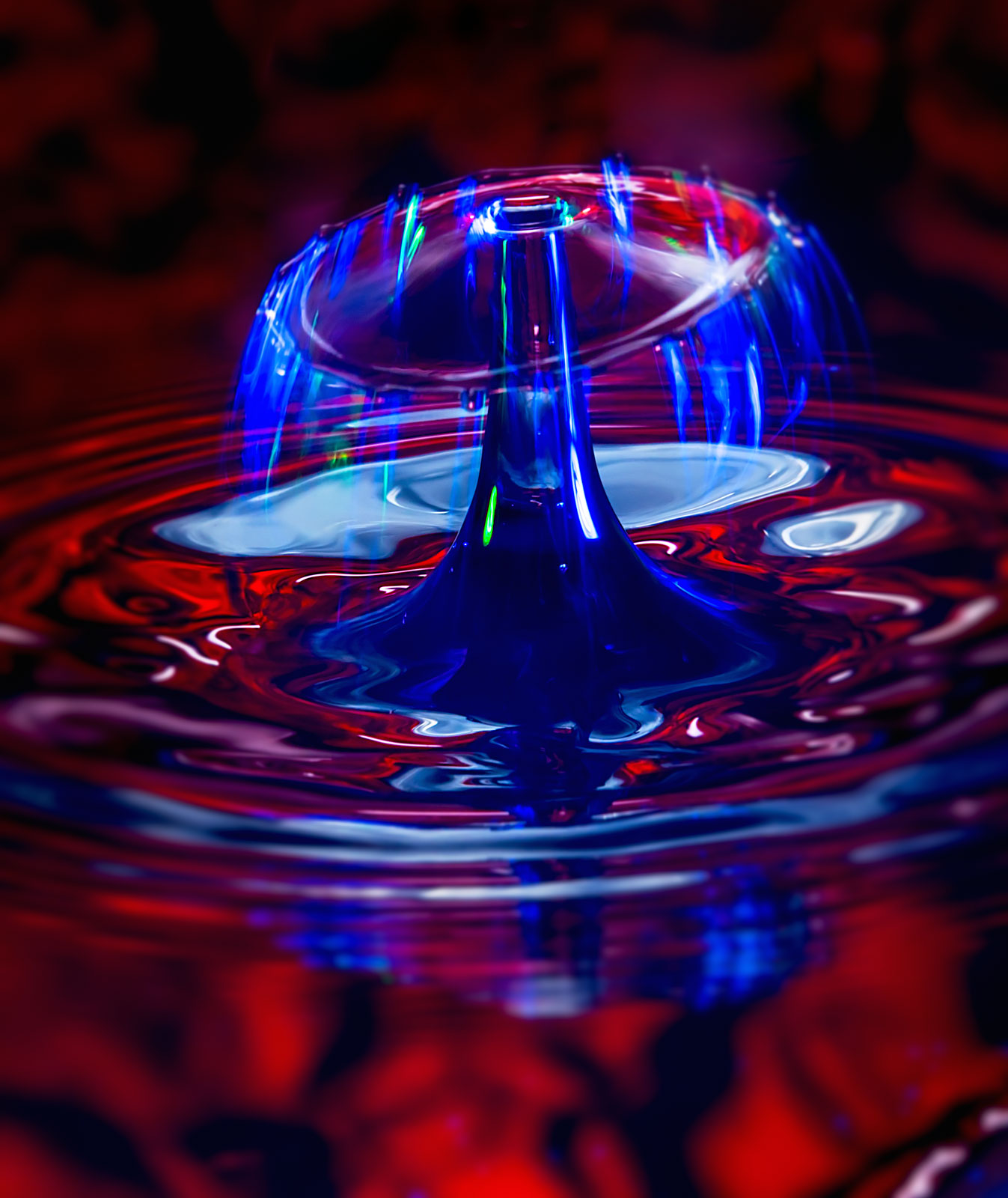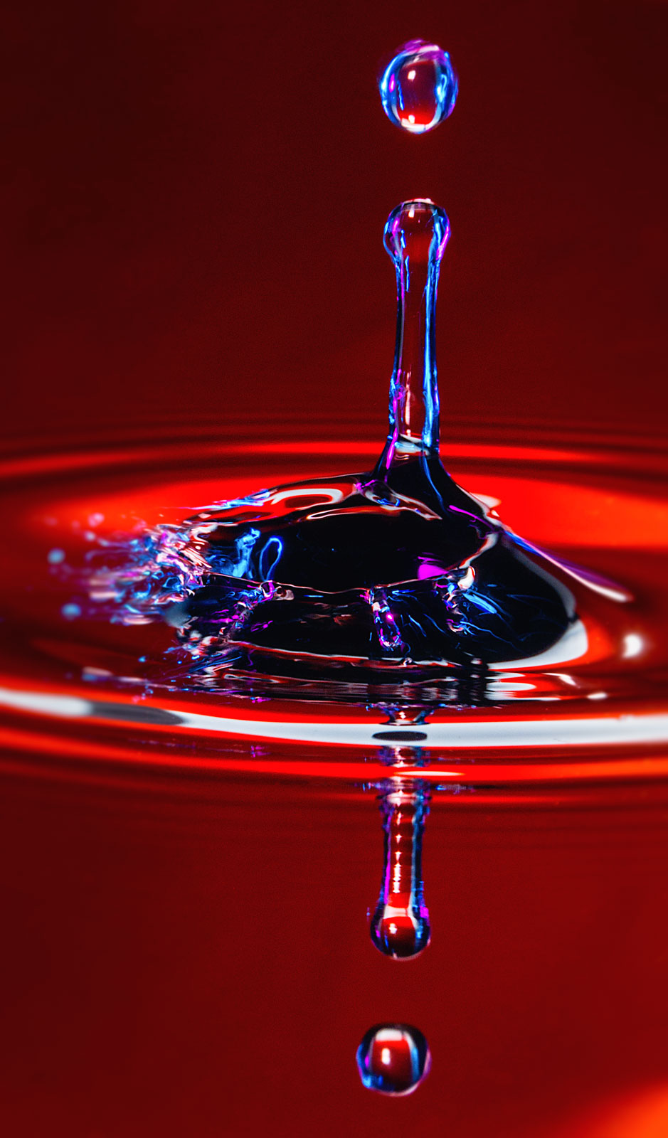 The same color palette was used in the image above. The speedlight gels were changed as well as moving to an orange color paper background. It is slightly underexposed to get very rich red color. The camera is moved close to the scene by using an extension tube. The drops were let go very close together and the tube was tilted at a slight angle which caused the drops to be less symmetrical.