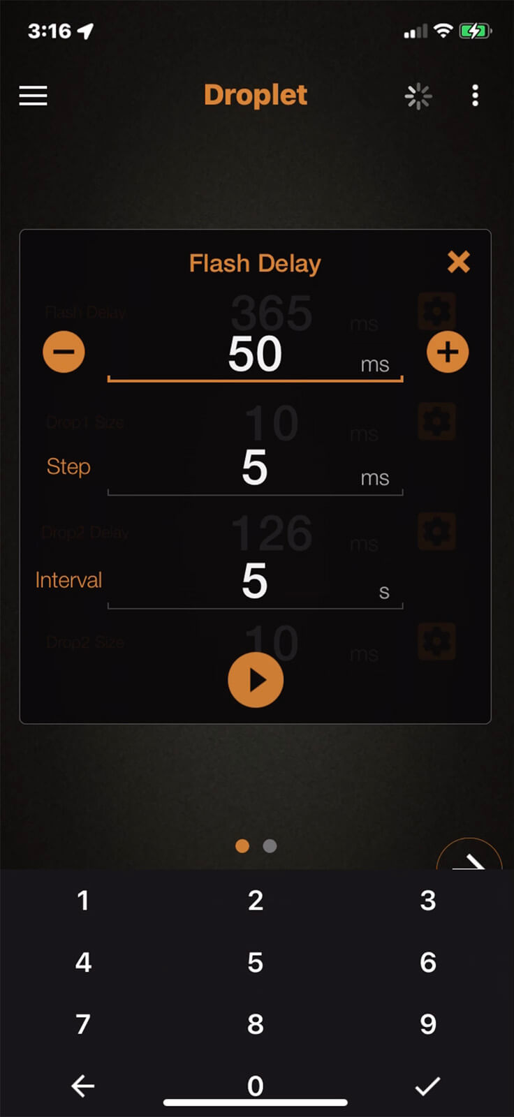 Click the auto-calibrate button to the right of the Flash Delay setting. Set Step to 5ms and Interval to 5ms, then click the Start Calibration button. Pluto Trigger will now take a photo every five seconds and increase the Flash Delay by 5ms each time. Monitor the screen of your camera. When the droplet reaches its highest point, stop the calibration.