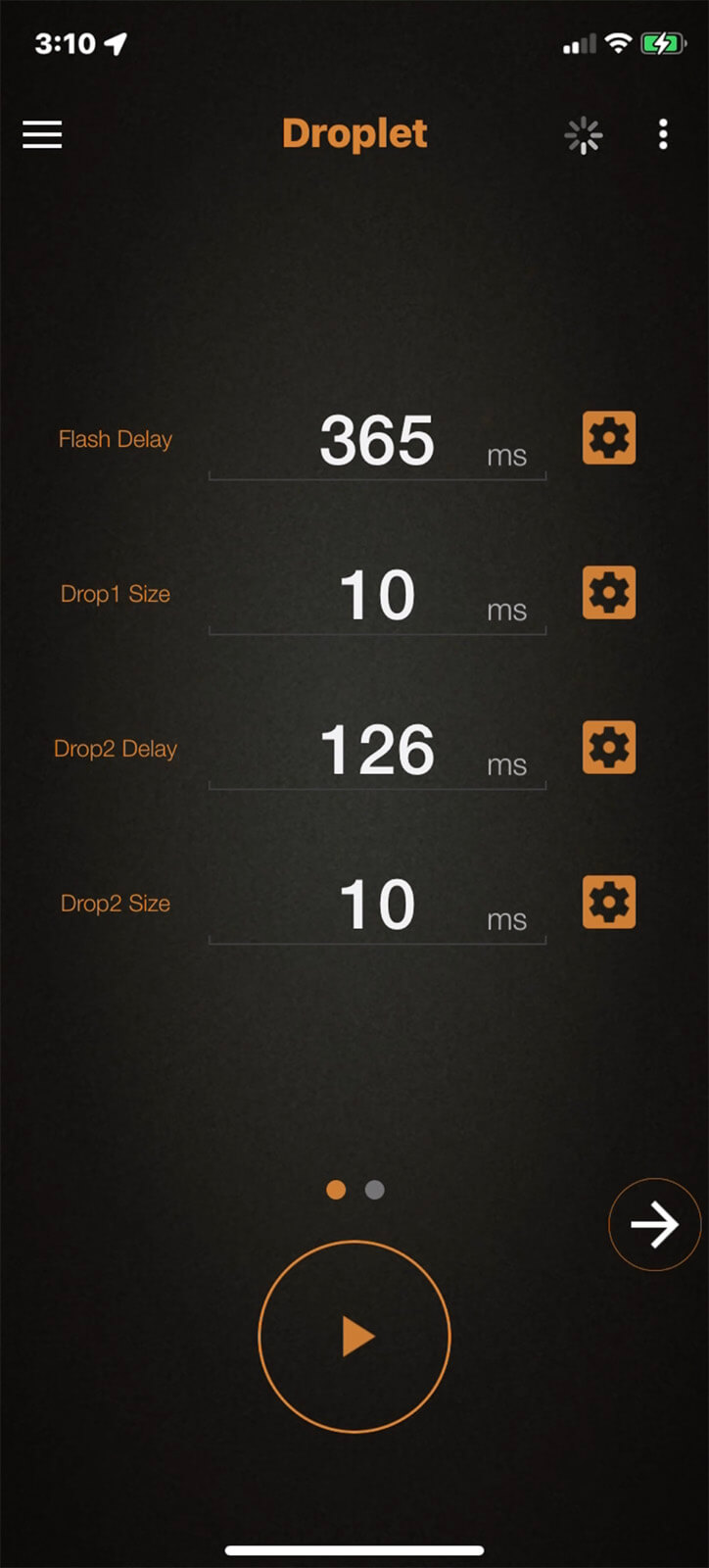 Next set the Drop2 Size to 10ms and calibrate the Drop2 Delay following the same series of steps as above. The procedure is similar to that of the Flash Delay calibration. Once the second drop starts colliding with the first you are just getting started with the collisions. A great place to be!