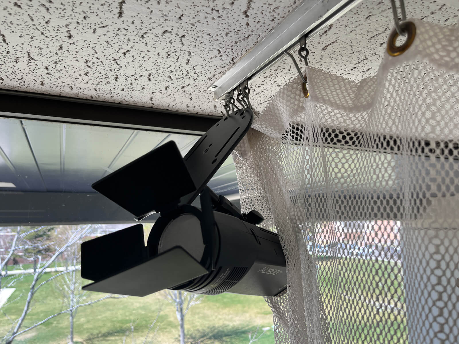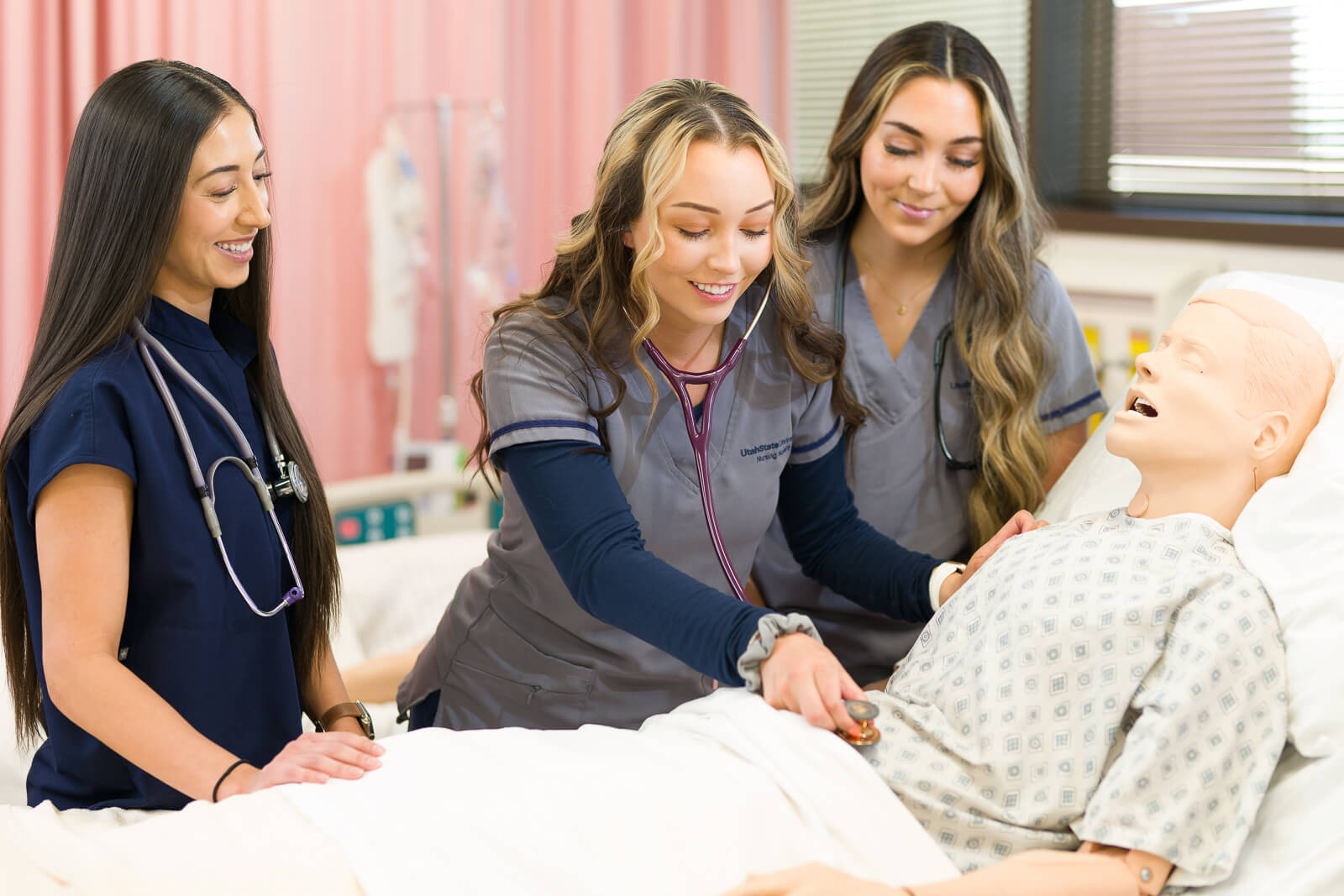 Back to portrait mode, I used my Max to hang my lights from the curtain in a nursing lab to supplement the light coming in the windows. It’s the main light in this photo. It was superior to using a stand because I later put the subjects on the other side of the bed and used it as the rim light. Had it been on a stand, it would have been visible in the background and taking up space. Although I used Platypod Max in this case, Extreme is loaded with the same 3/8″-16 stud for either tripods or baby pins.